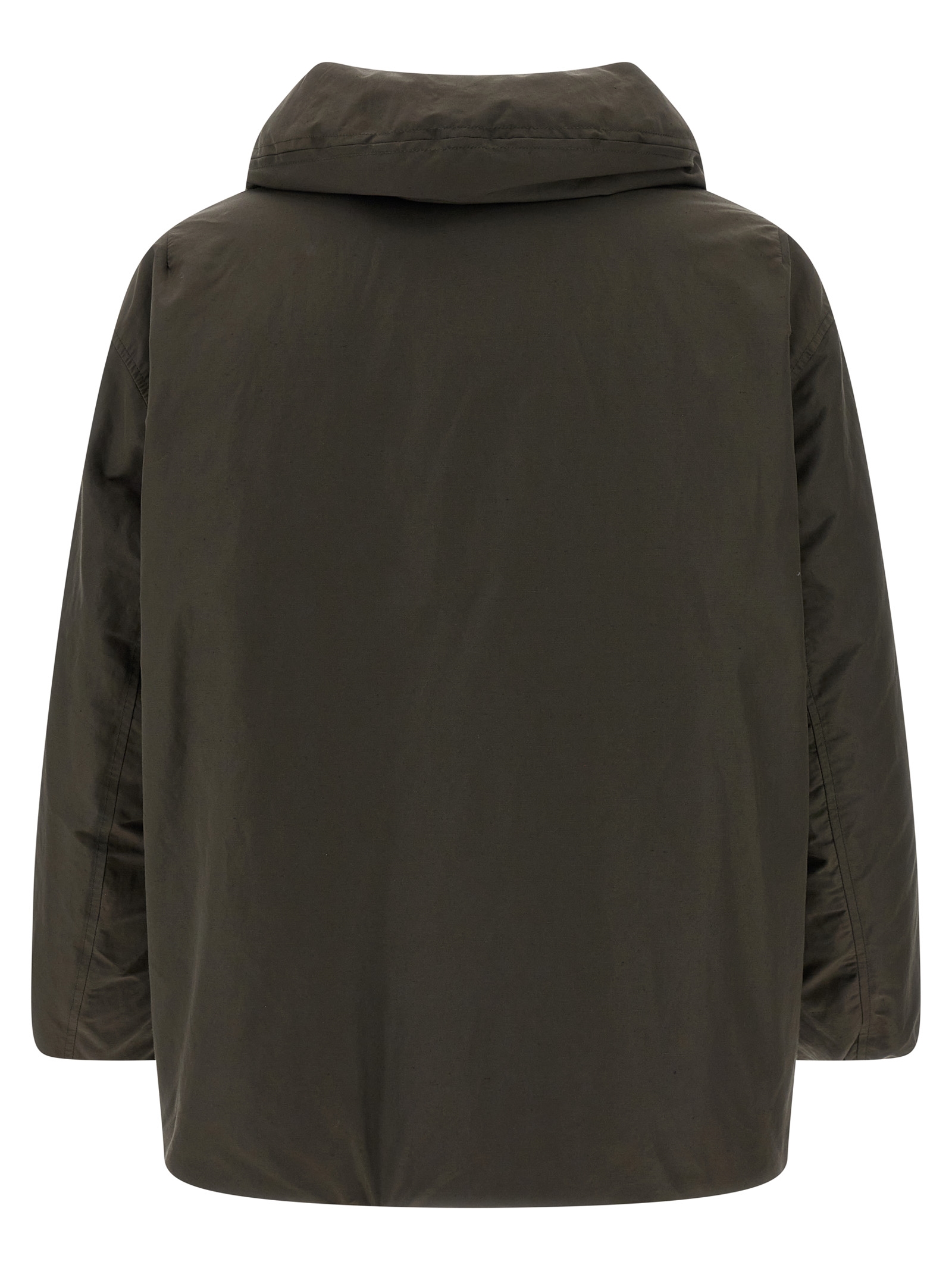 Linen and cotton blend down jacket with water repellent treatment, quilted and goose feather lining, bubble collar with chin guard, front zip and button closure, pockets, long sleeves with elastic cuffs.