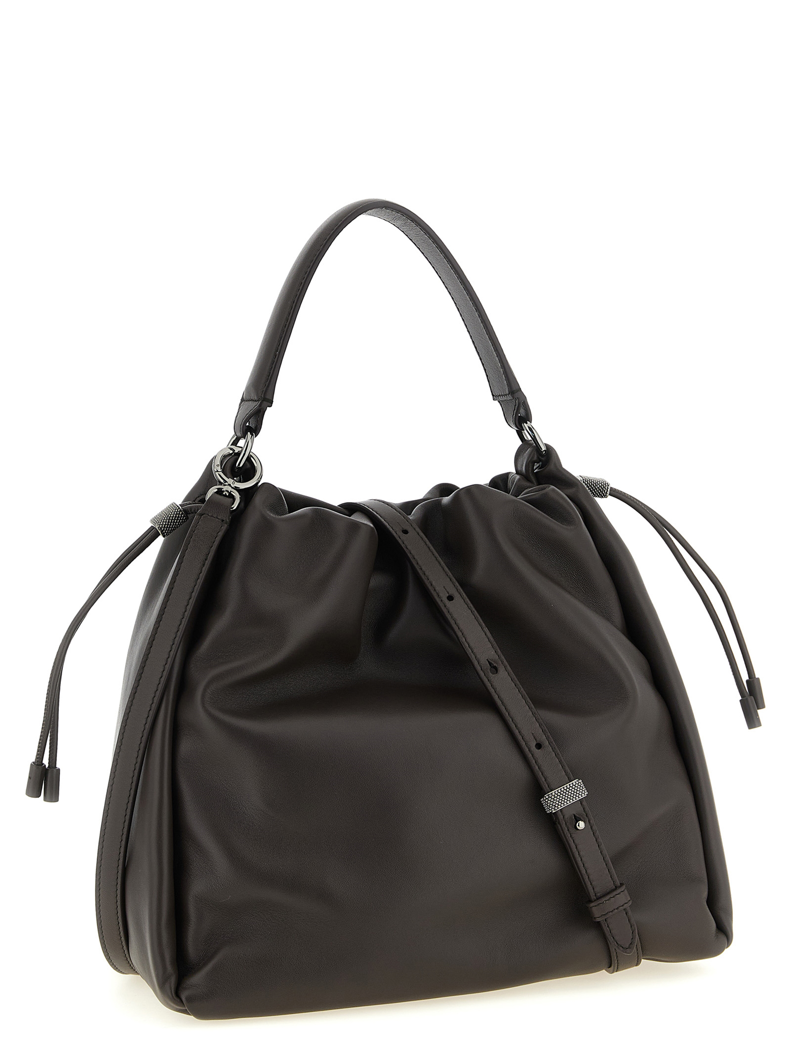 ‘Bucket Mellow’ bucket bag in Soft leather with front embossed logo, fixed handle, drawstring closure with ‘Monile’ details, adjustable and removable shoulder strap.