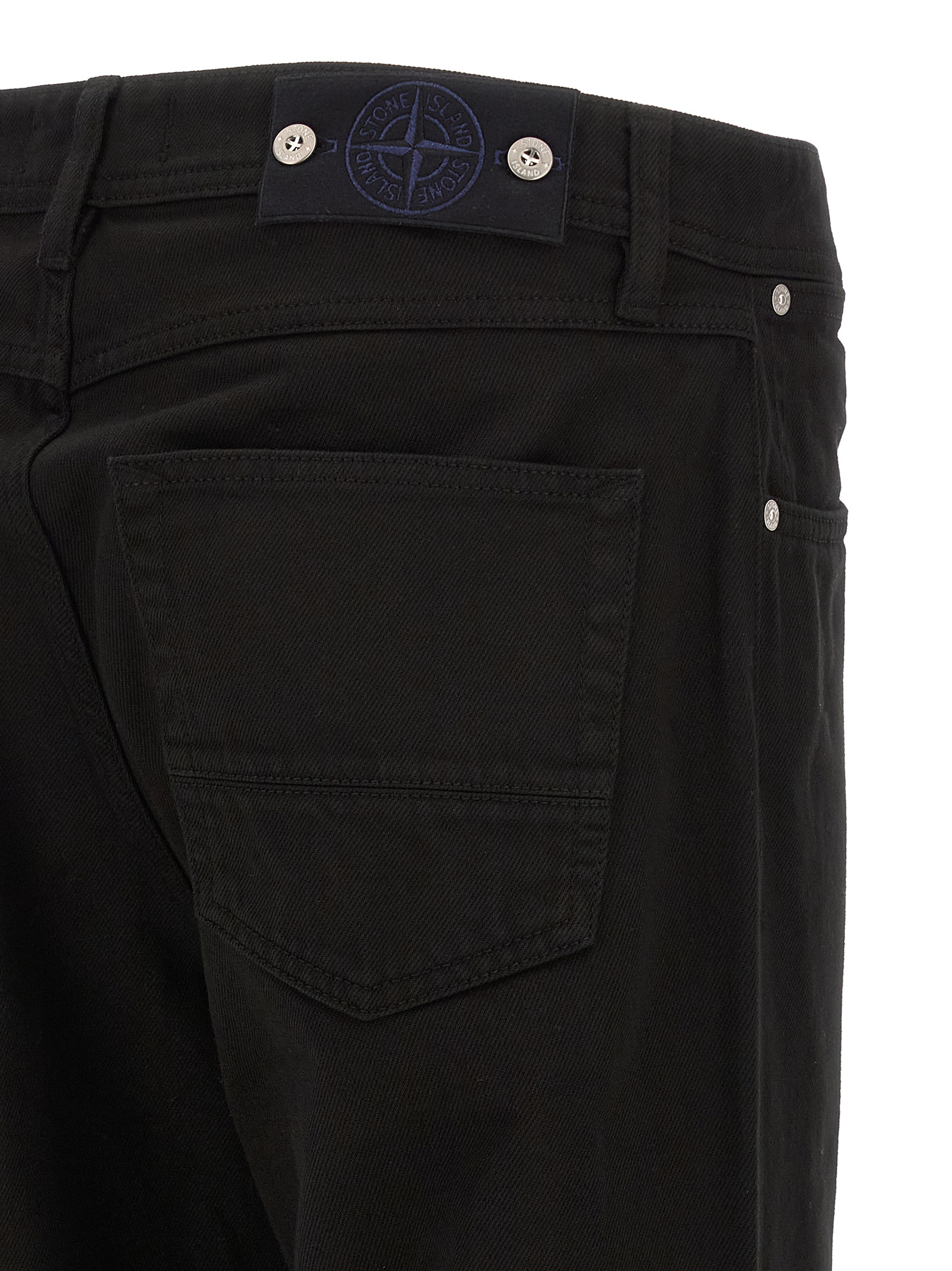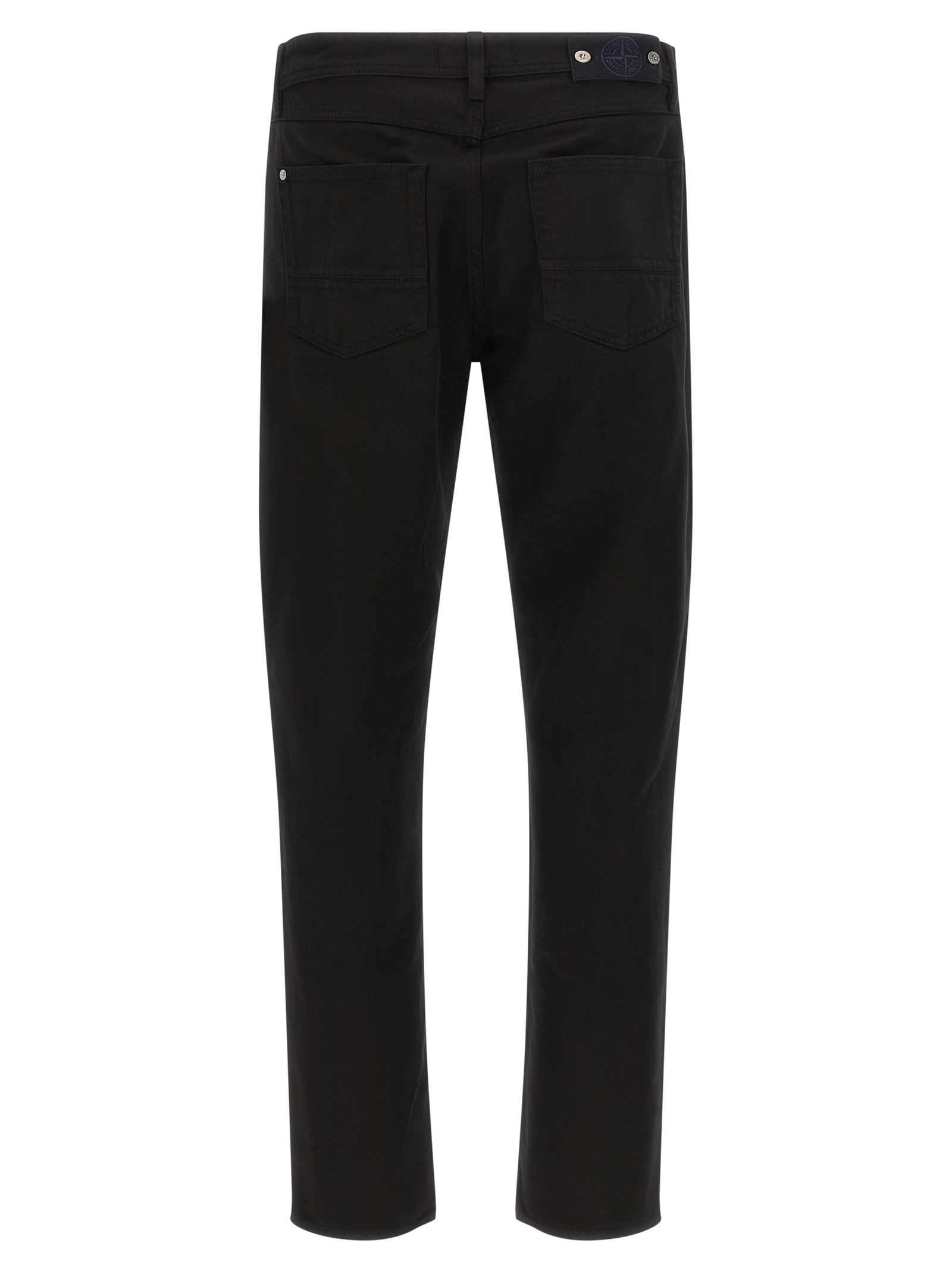 Garment-dyed Bull denim cotton canvas jeans, straight leg, front button closure, five pockets, logo badge on the back.