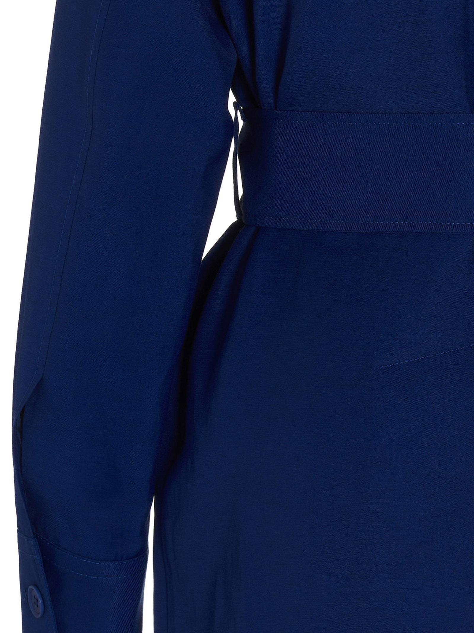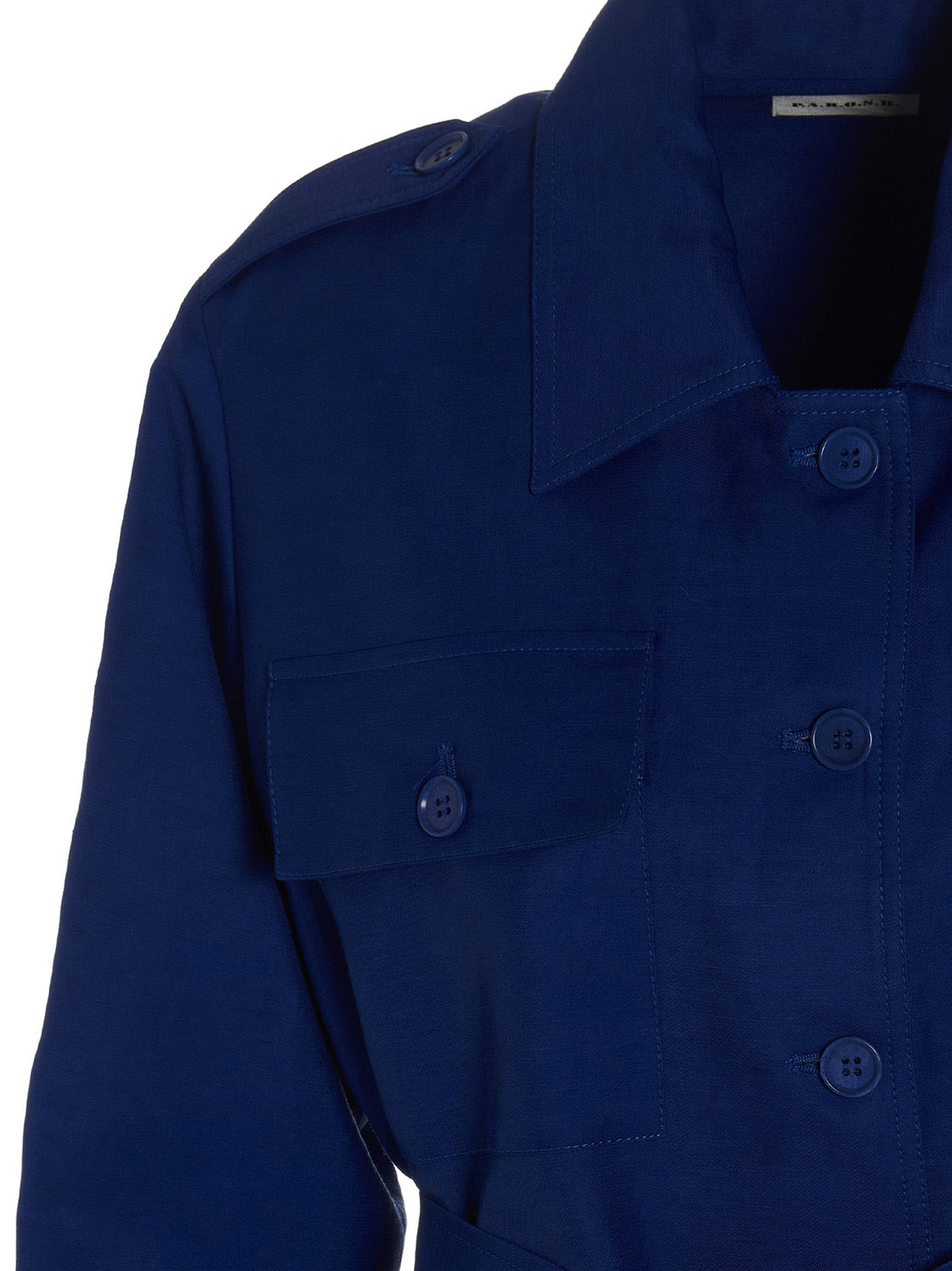 Viscose and linen blend bush jacket with button closure, a belt at the waist, pockets, and long cuffed sleeves.