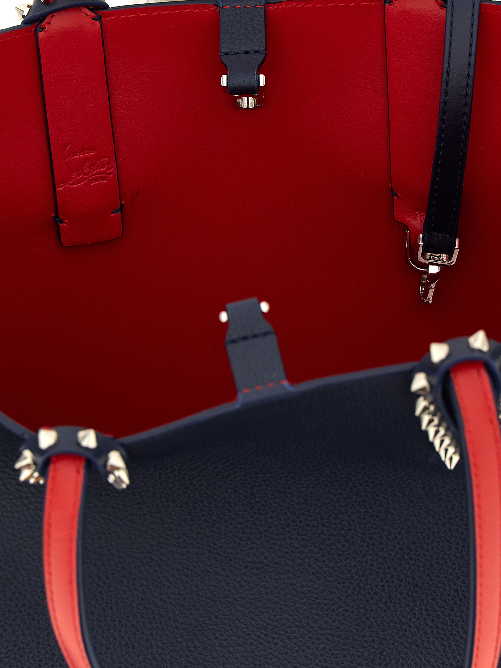 Cabata Small’ granulated leather shopping bag with contrasting interior, metal stud detail, double fixed handle, silicone outer hem with engraved logo, snap hook closure, removable matching clutch.