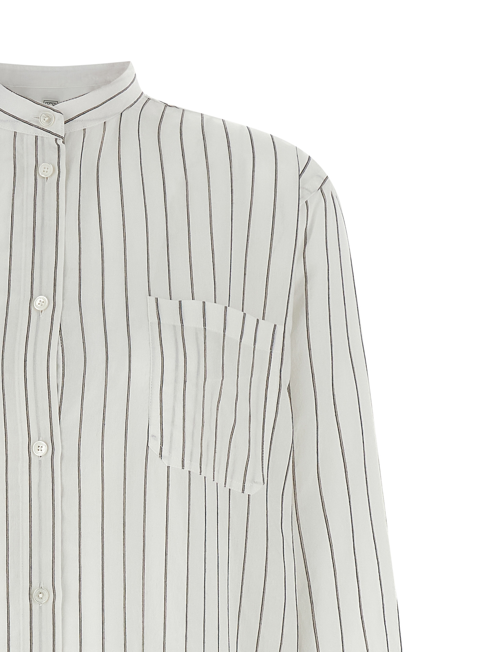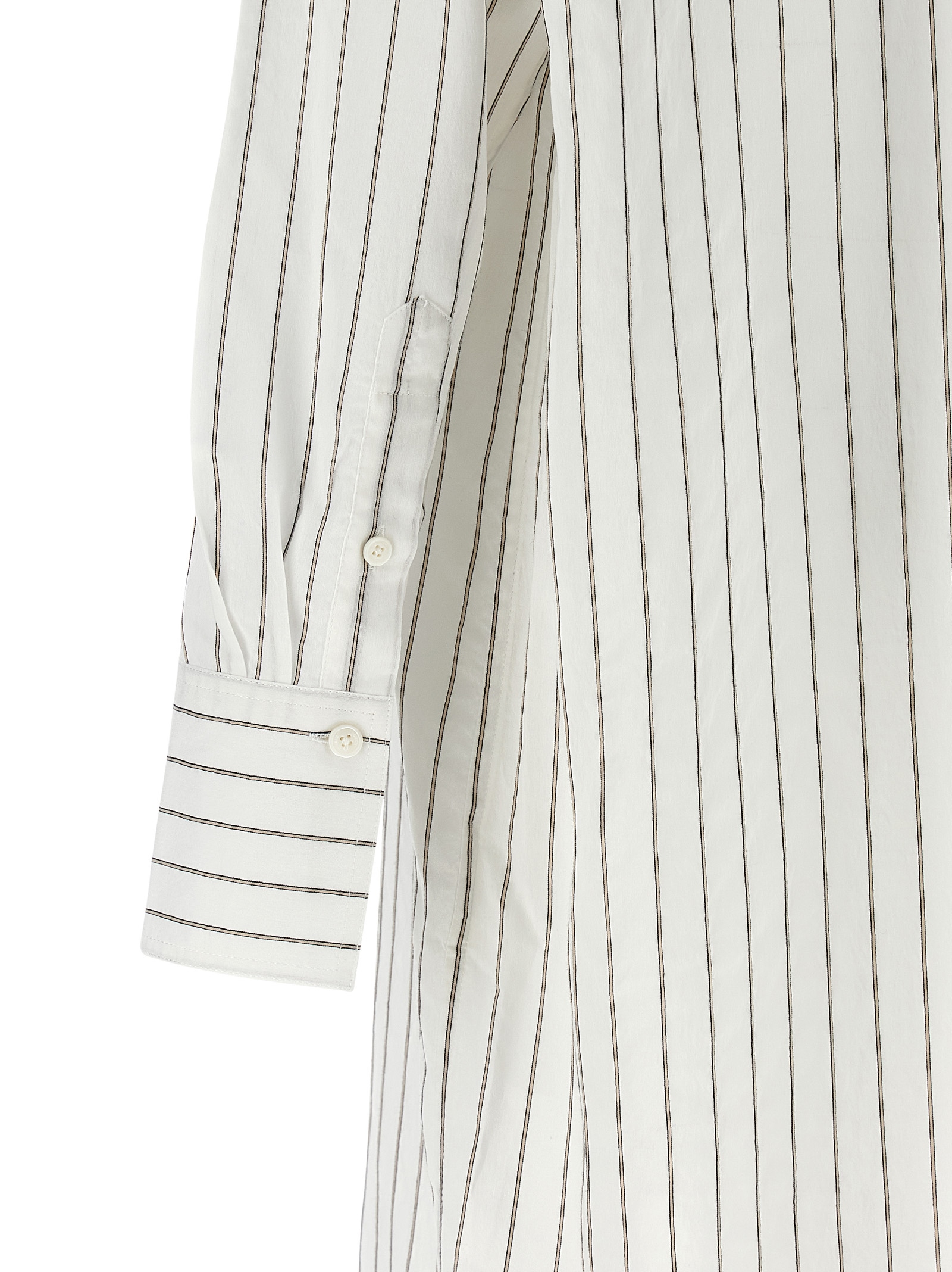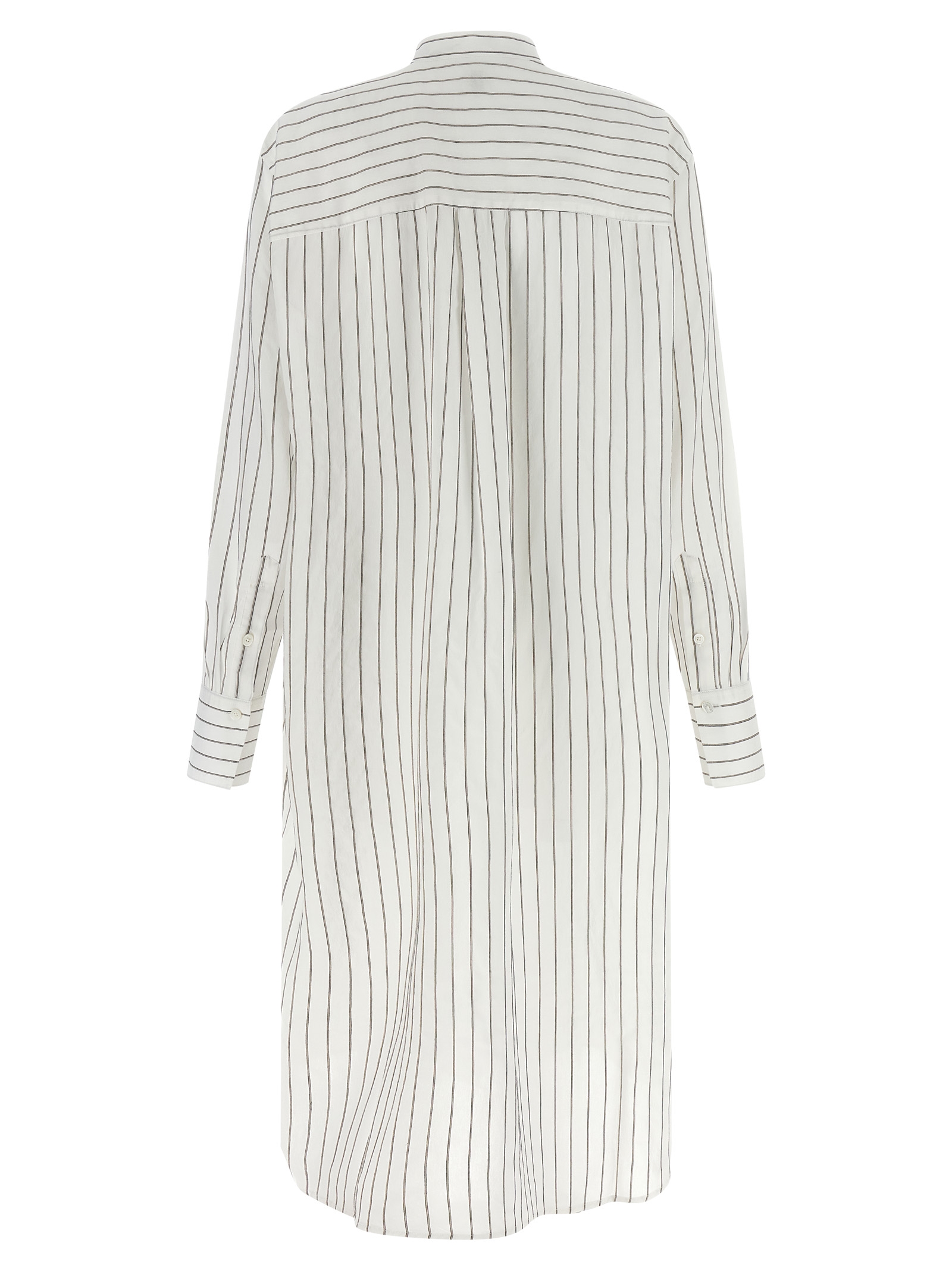 Midi dress in a light blend of viscose, silk and cotton with vertical striped pattern, chemisier model, caftan silhouette, mandarin collar, breast pocket, front mother-of-pearl button closure, long cuffed sleeves, rounded hem, back rack with cannon pleats.