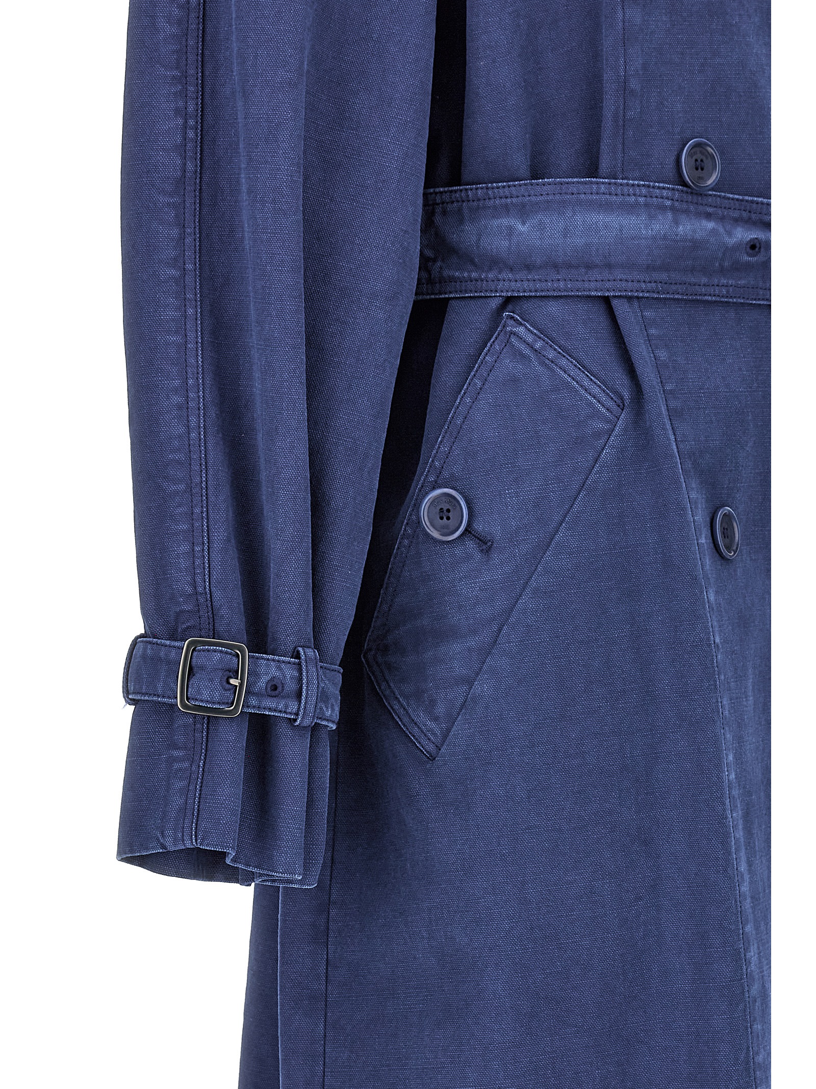 ‘Calao’ double-breasted cotton trench coat with adjustable belt at the waist, long sleeves with adjustable straps, front pockets, back vent.