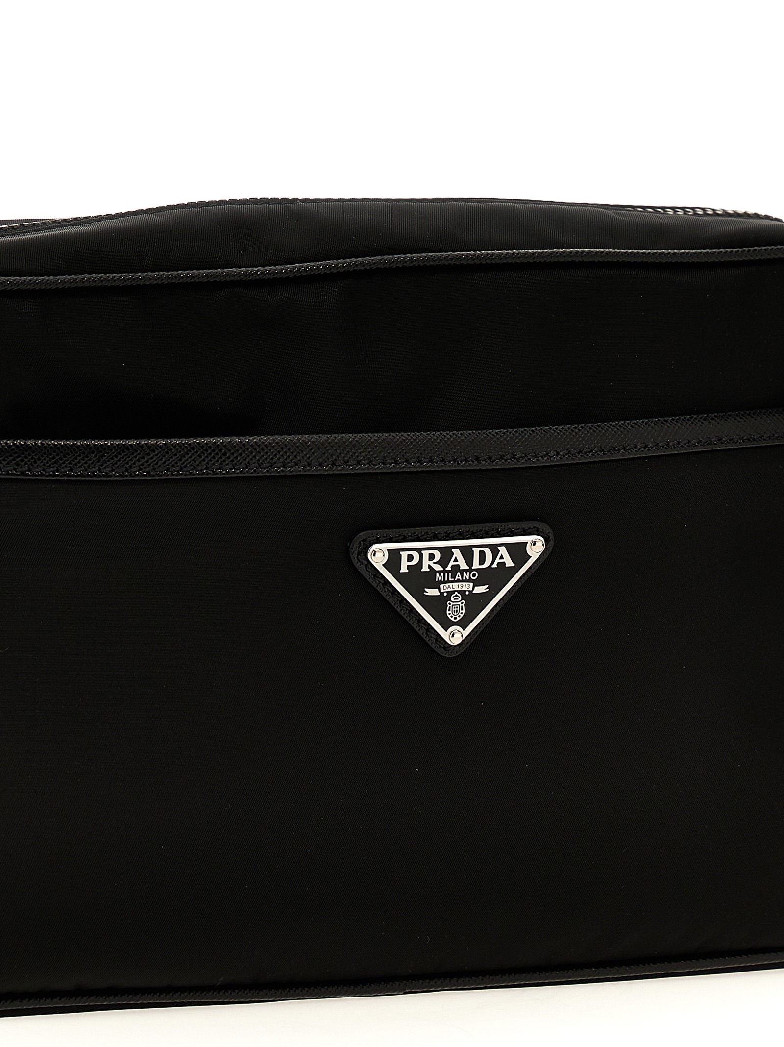 ‘Camera bag’ Re-nylon crossbody bag with zip closure, triangle metal front logo, adjustable shoulder strap.