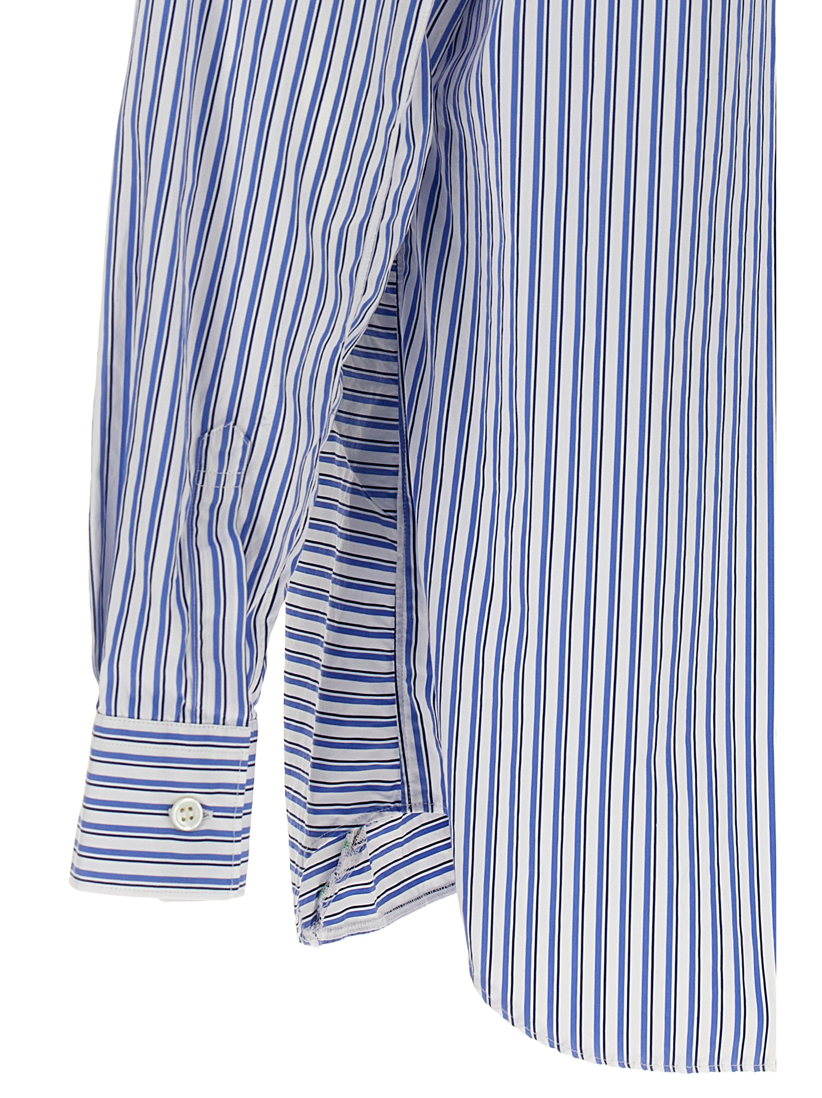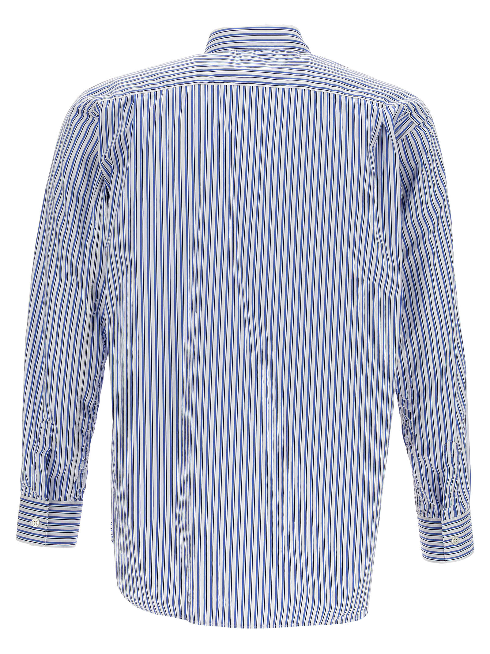 Comme Des Garçons Shirt x Brett Westfall striped cotton shirt with front patchwork detail, button closure and long cuffed sleeves.