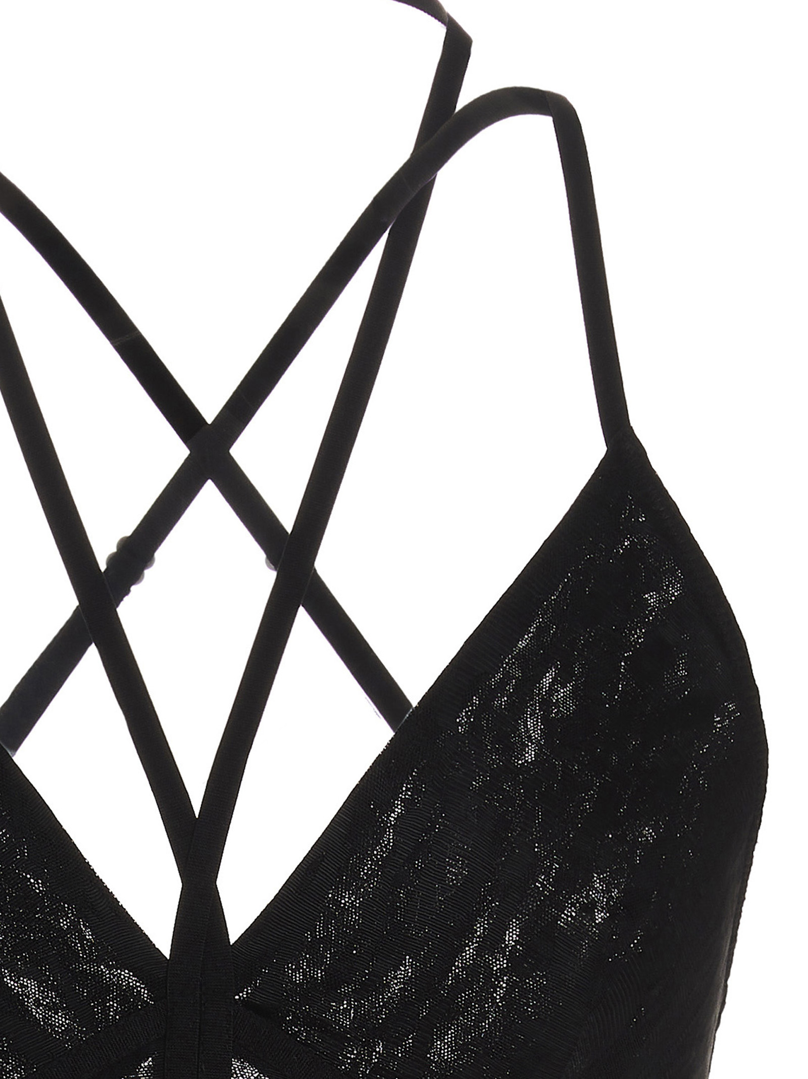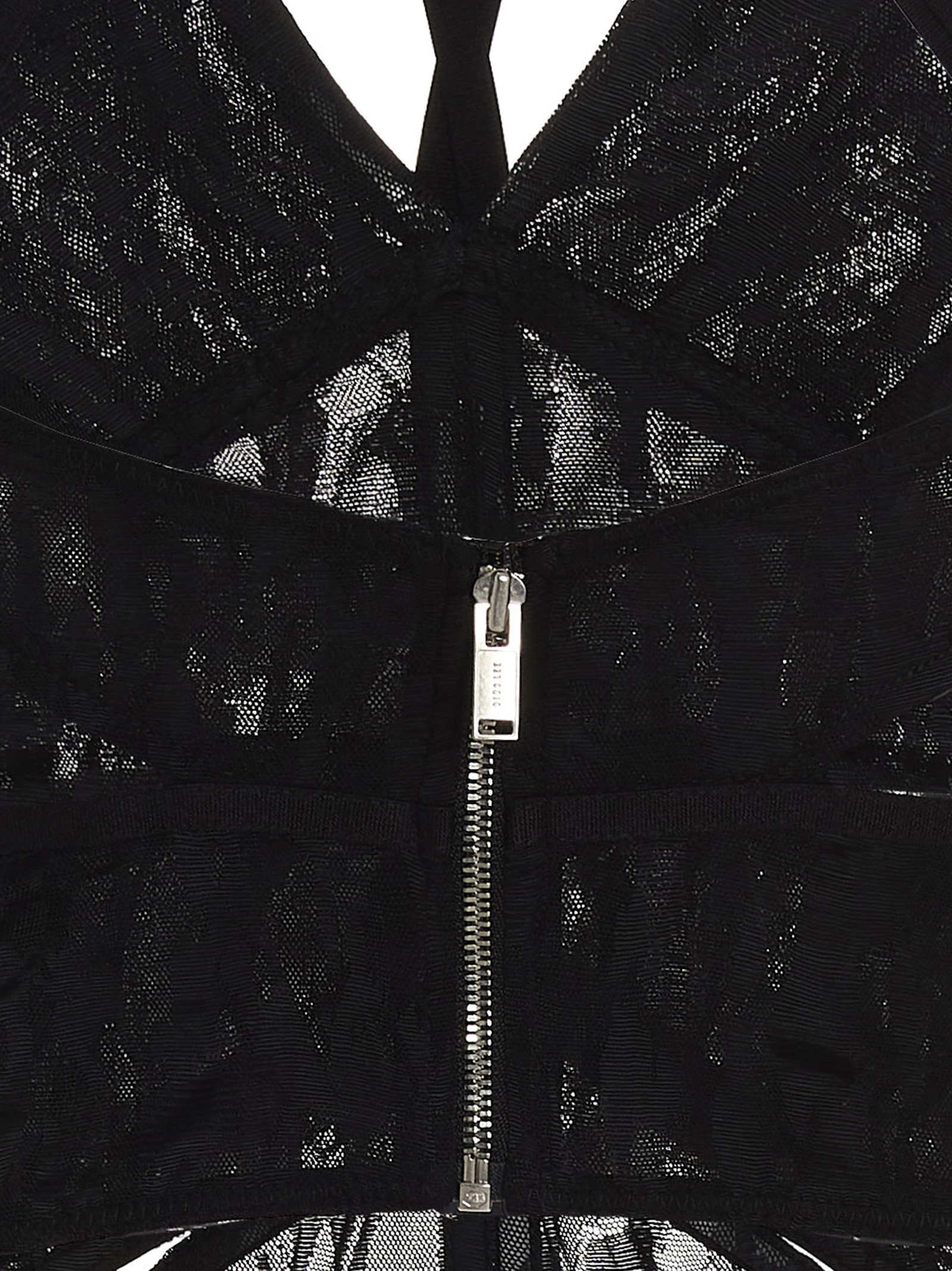 ‘Camo Lace’ lace top with a back zip closure, adjustable thin laces with a crossover at the back, a plunging neckline and front boning.