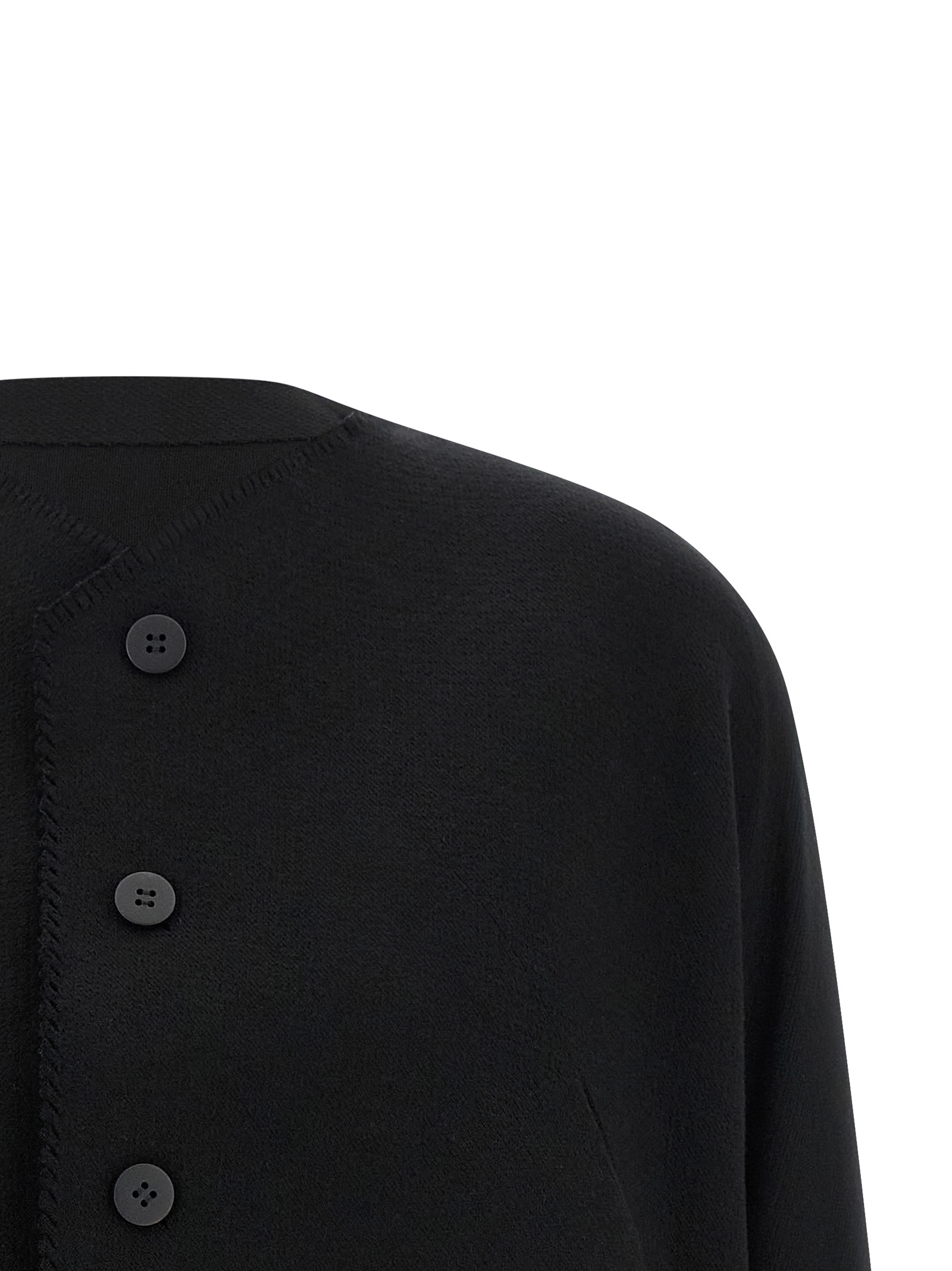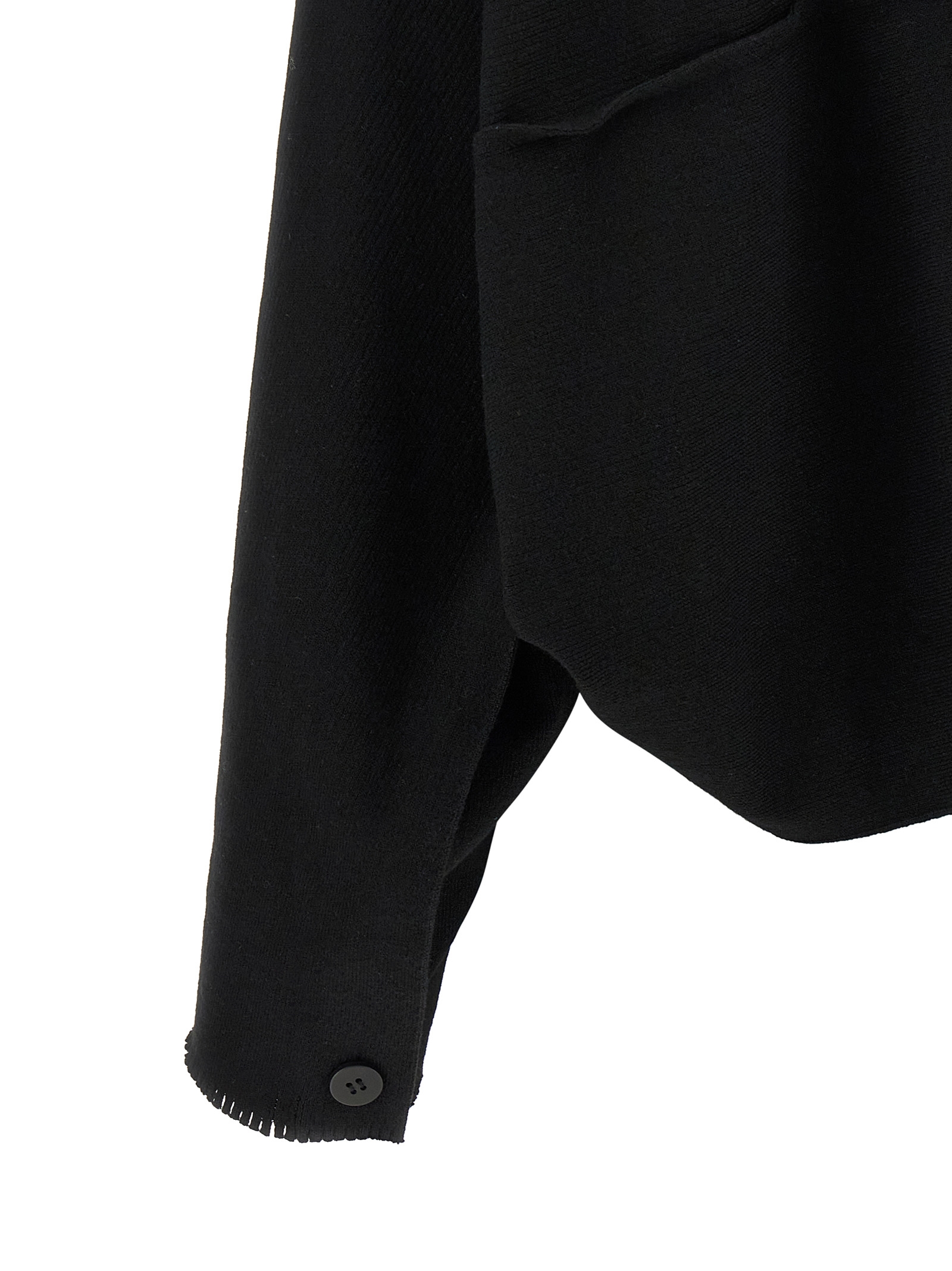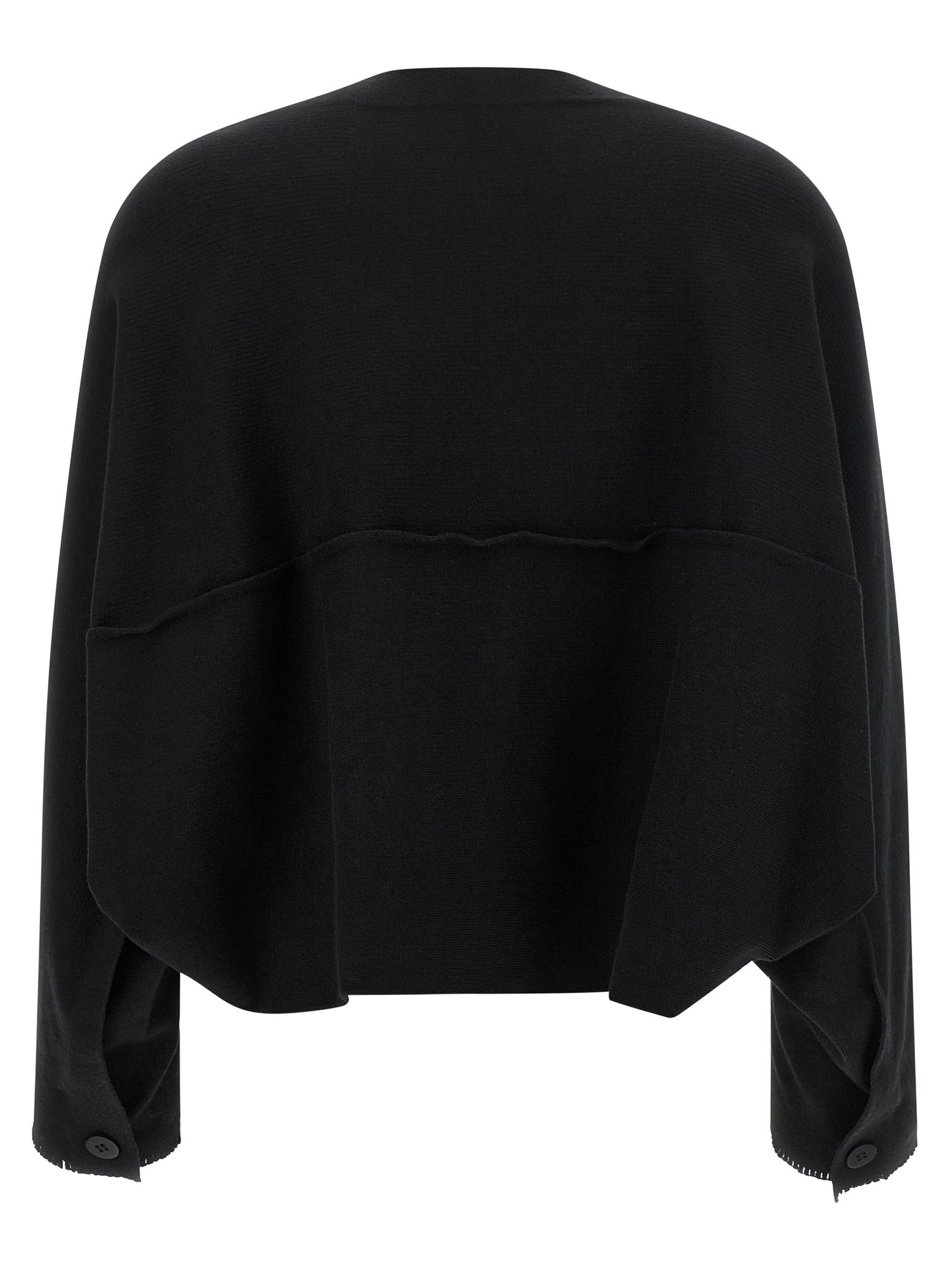 ‘Campagne’ 9-gauge cotton blend A-POC cardigan with trapeze silhouette, V-neck, front button closure, pockets, long bat sleeves, fringes.