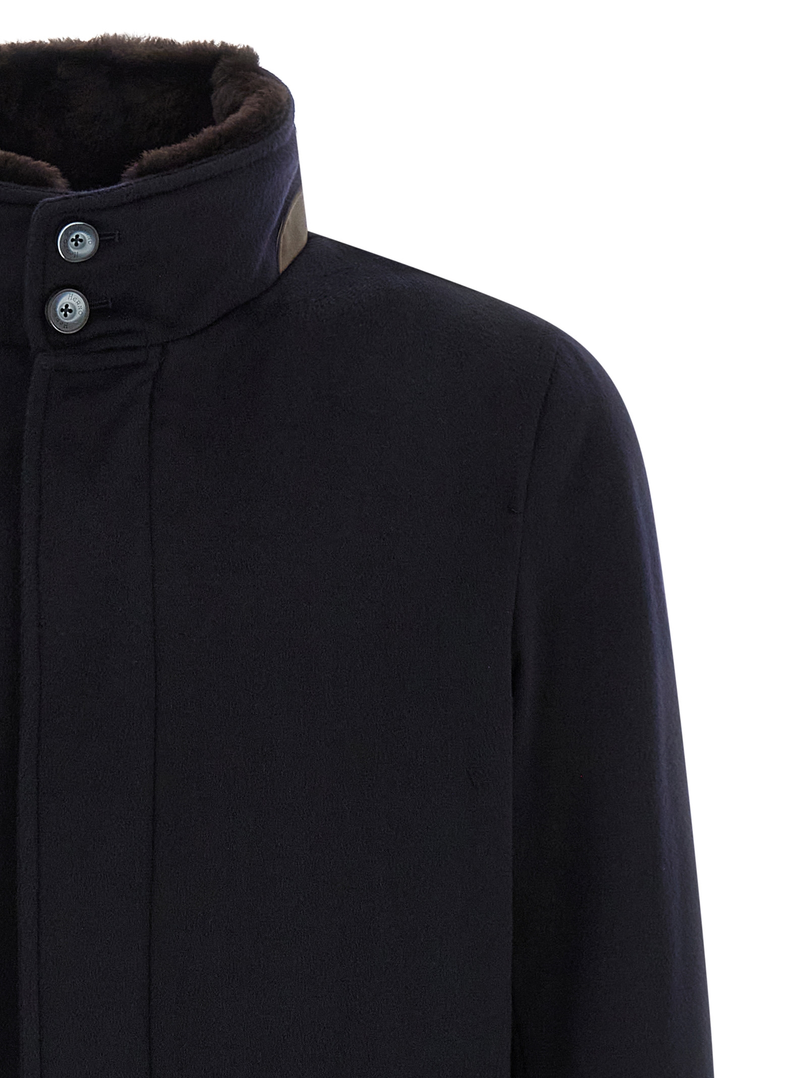Cashmere car coat with water repellent treatment, slightly padded quilted nylon lining, high neck with removable sherling insert, zip closure and front snap buttons, pockets, long sleeves.
