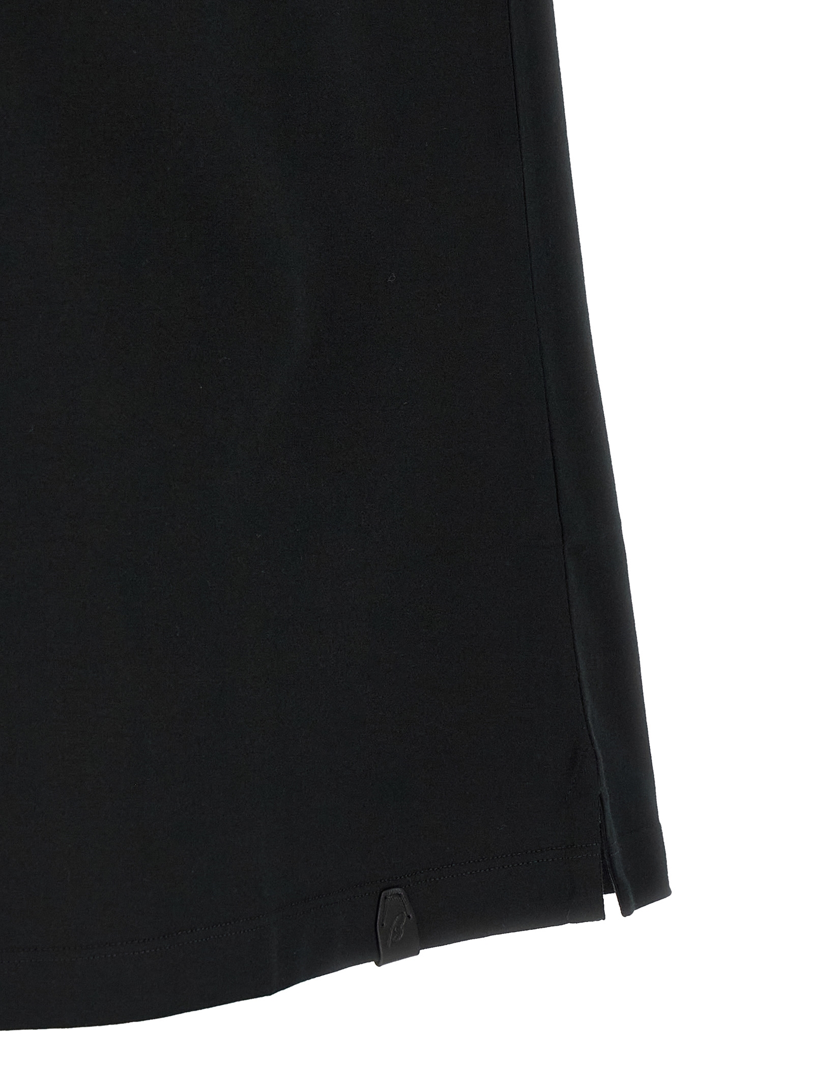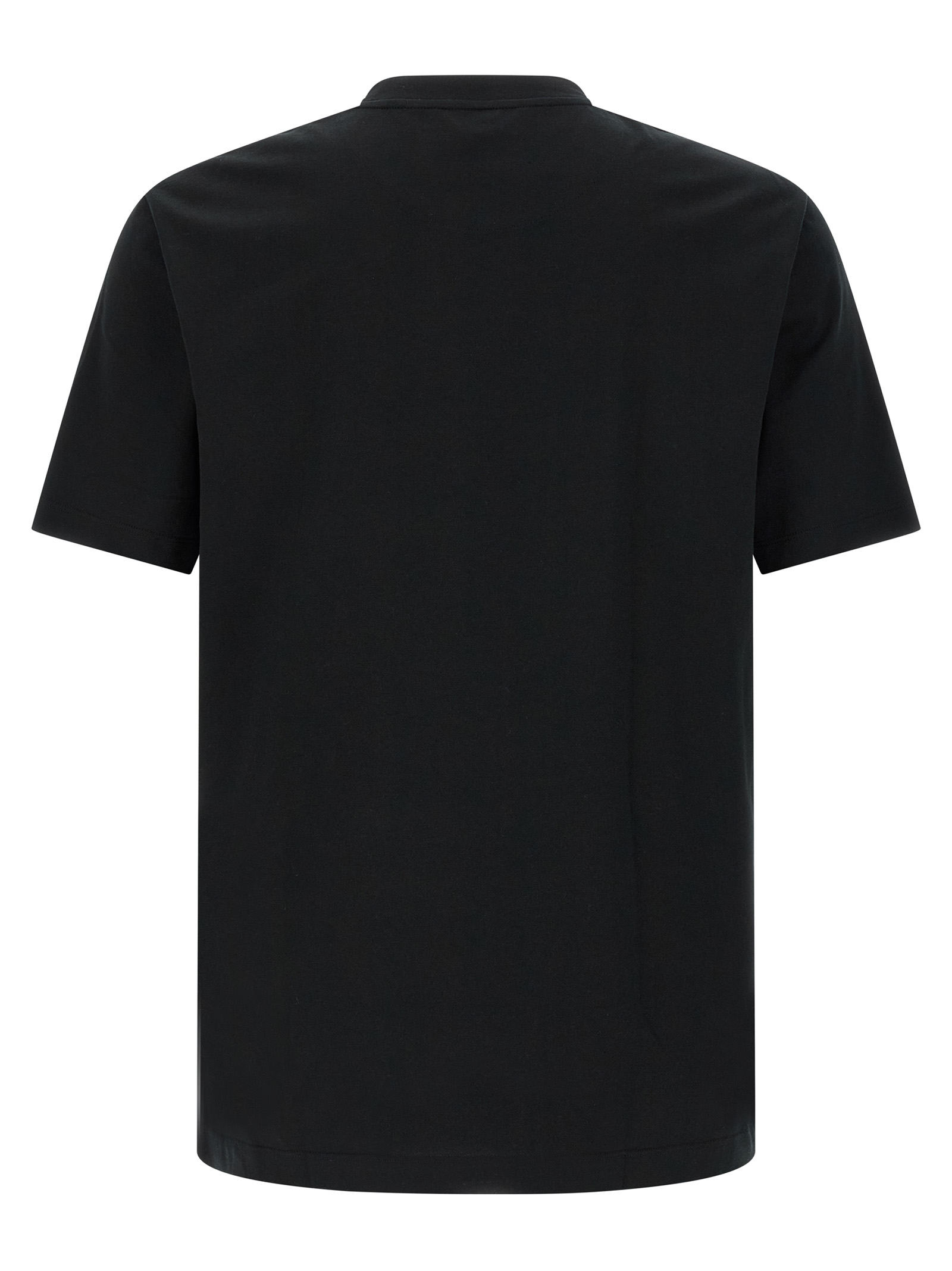 Carbonated cotton T-shirt, tone-on-tone leather fly with front embossed logo, crew neck, short sleeves, side slits.
