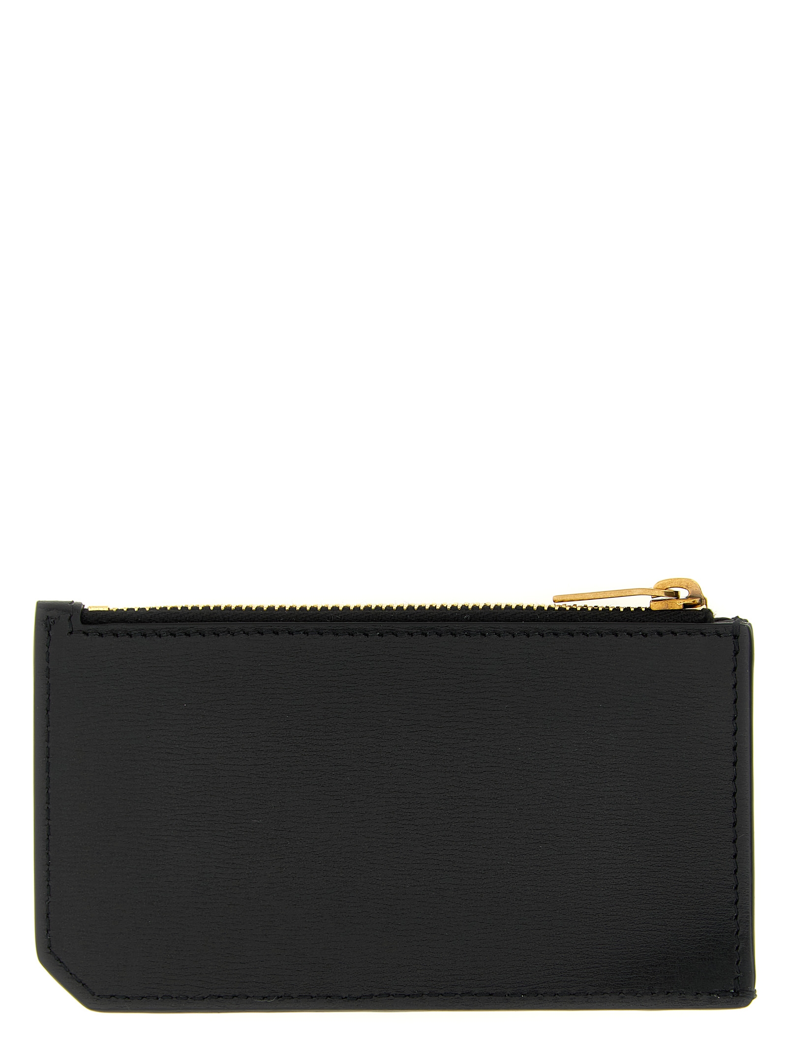 Glossy leather ‘Fragments Tiny Cassandre’ gusseted card case, top zipper closure, card holder and metallic antique effect Cassandre logo on front.