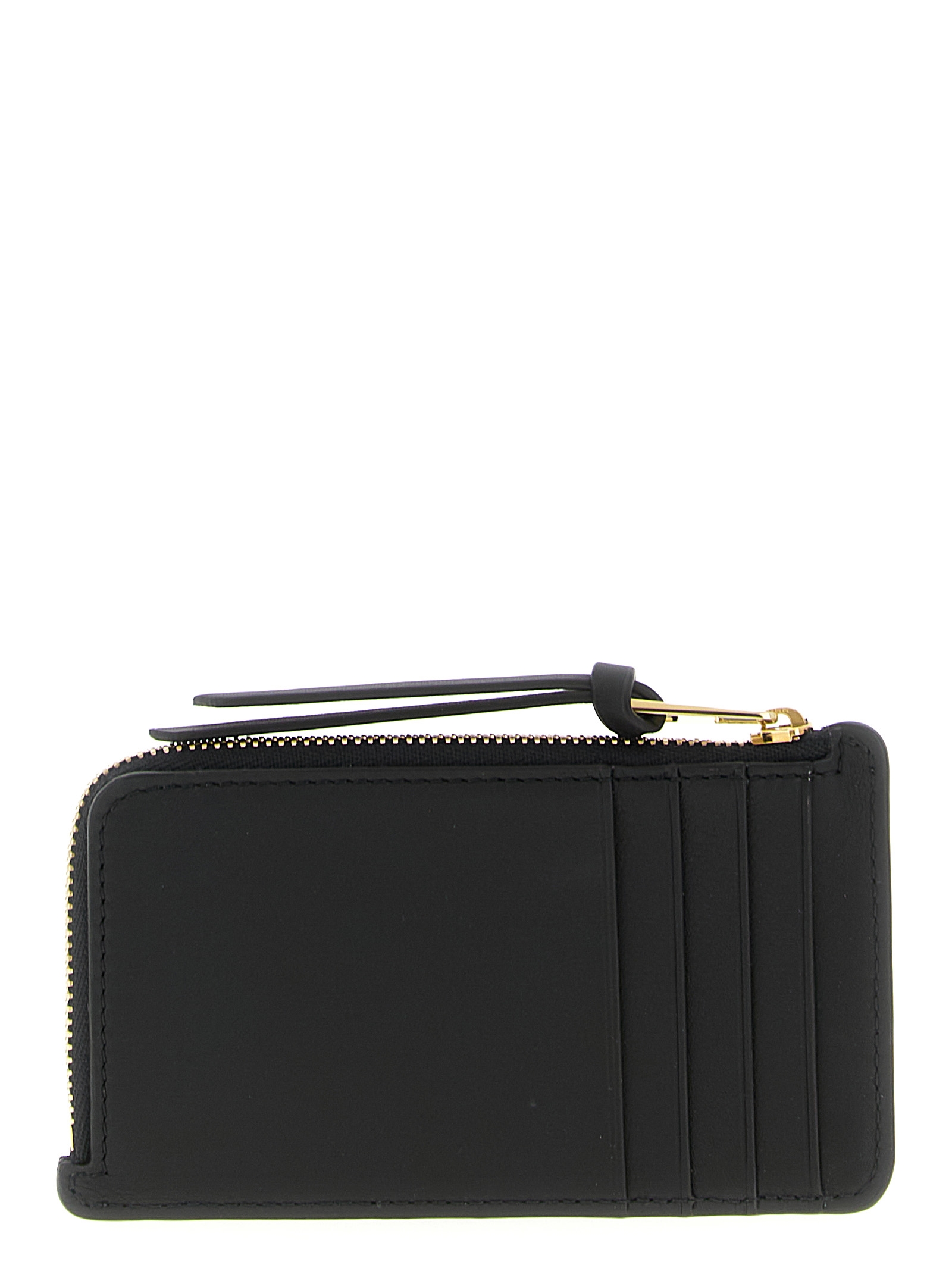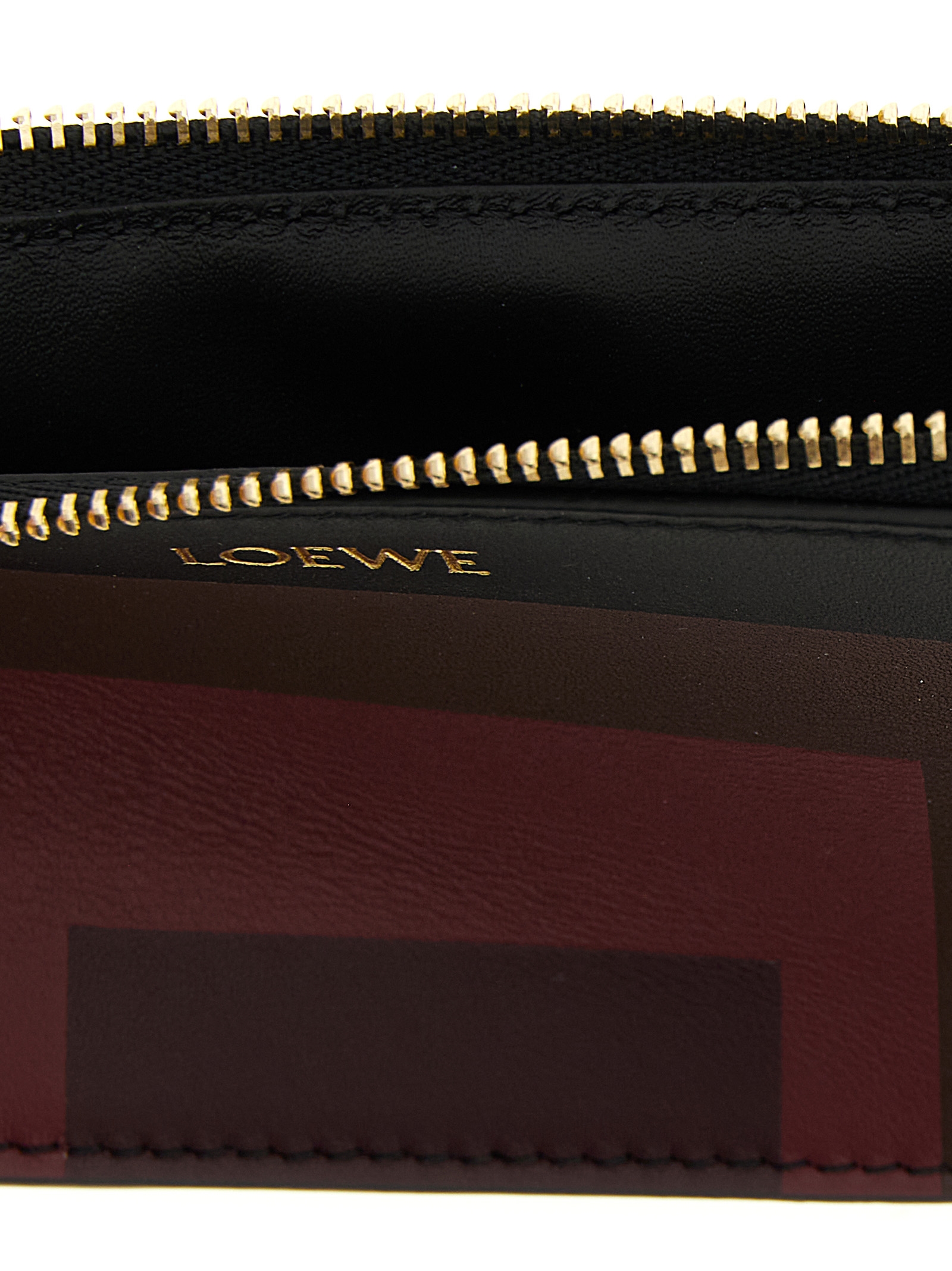 Calf nappa card holder with inlaid squares inspired by Josef Albers’ “Homage to the Square” series, front embossed logo, and top zip closure.