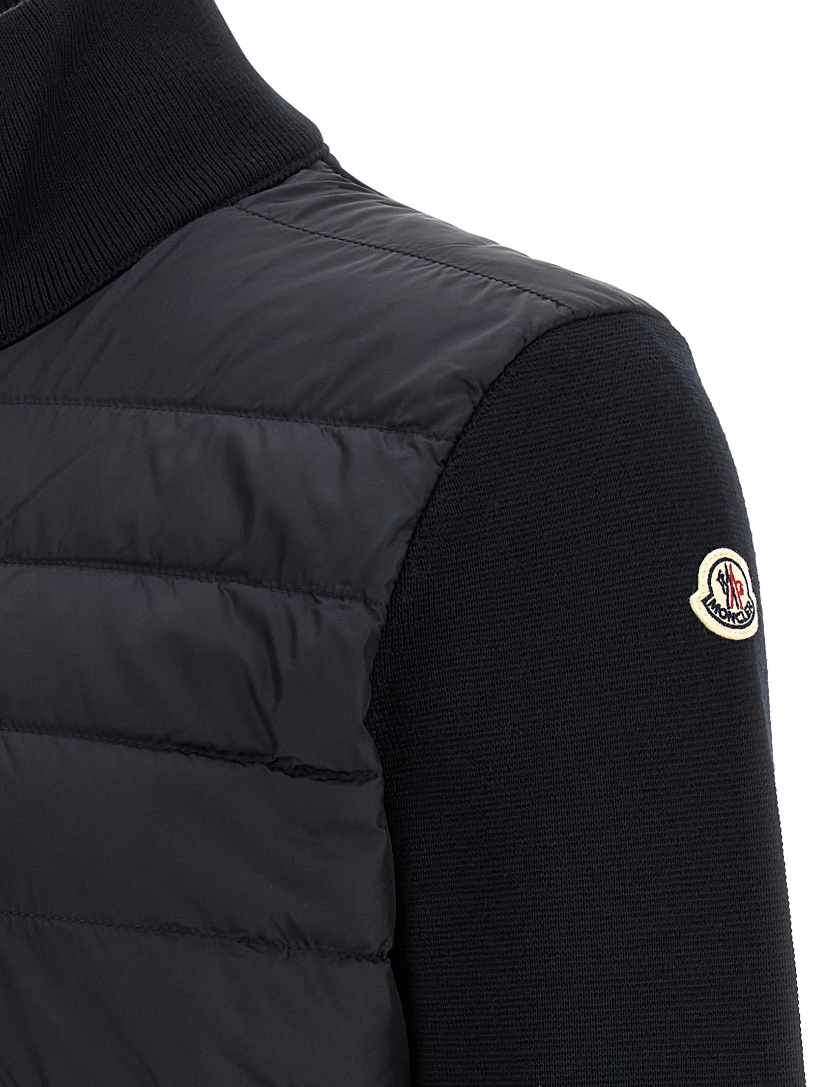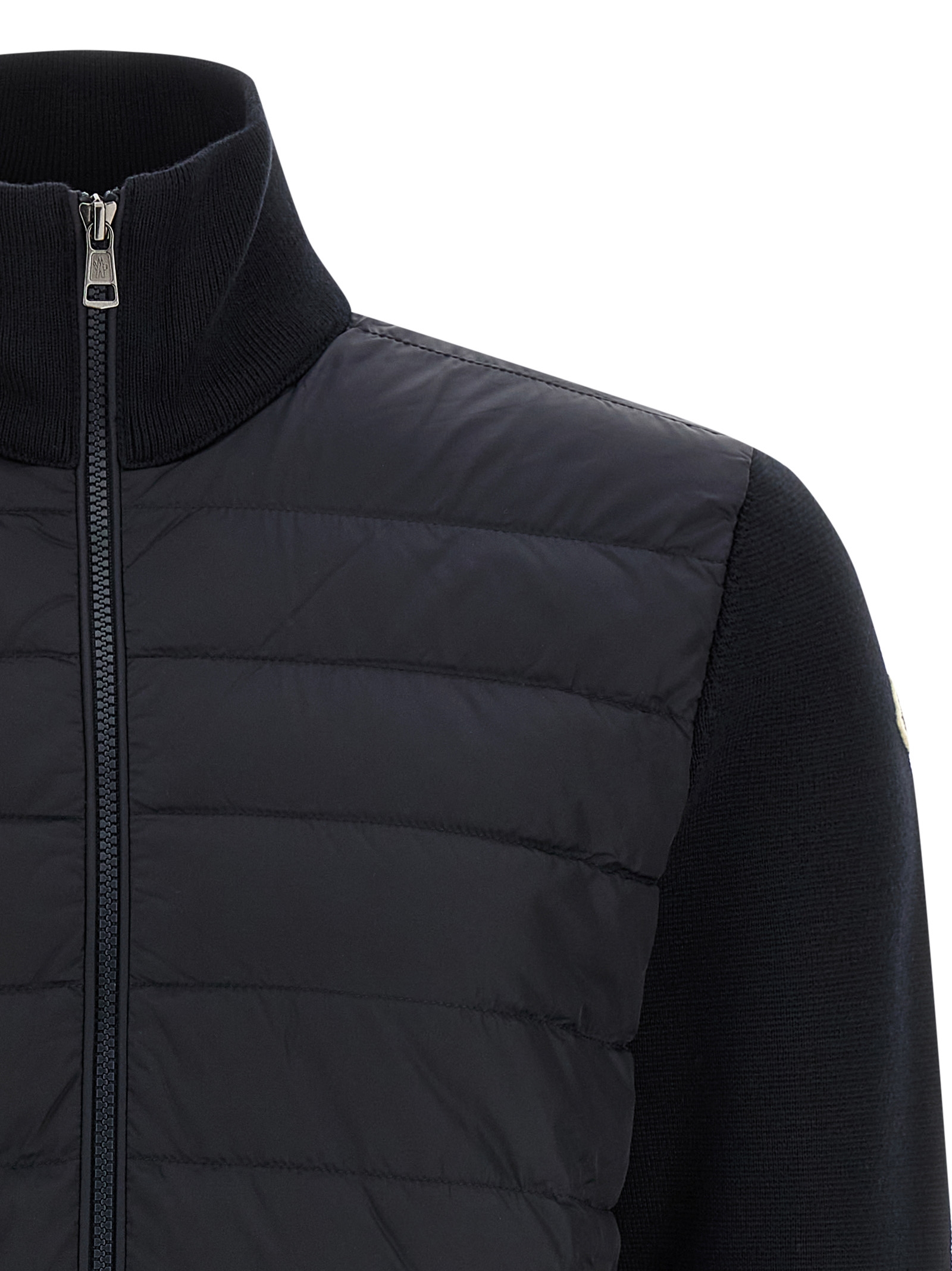 Shaved knit Tricot cardigan, AirSoft quilted nylon front vest, high neck, front zip closure, long cuffed sleeves and felt logo patch, pockets.