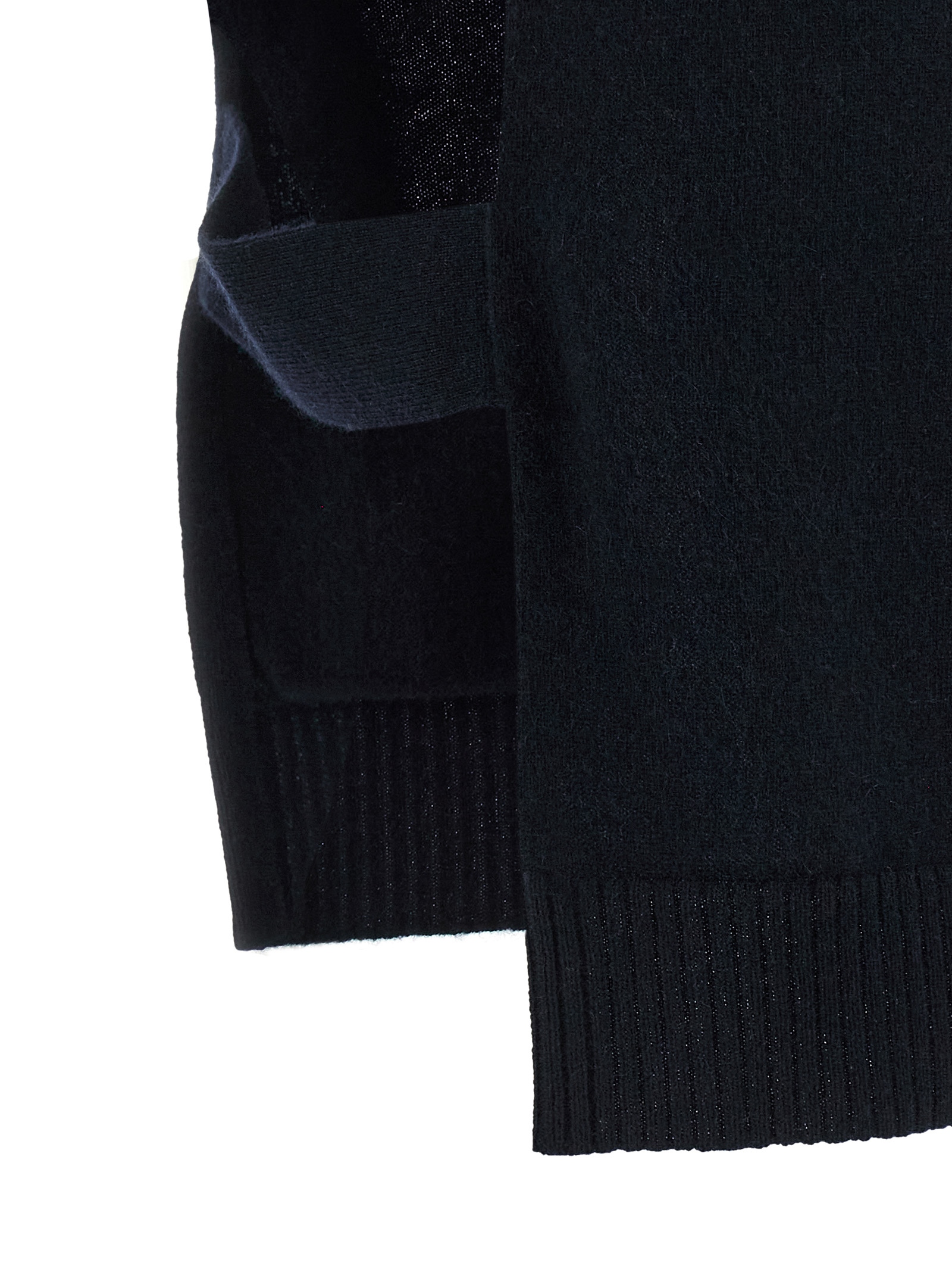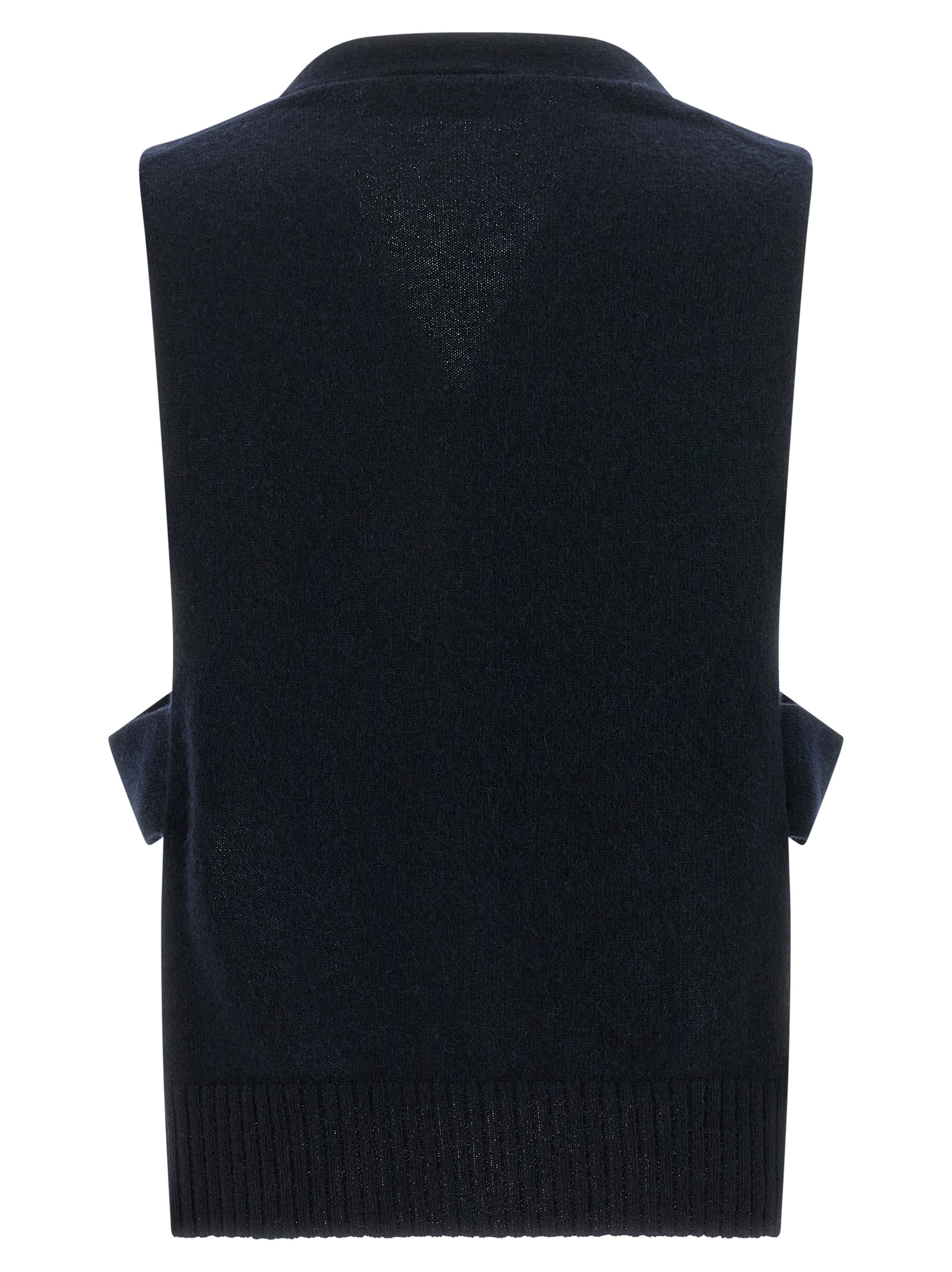 Shaved cashmere vest, cardigan style, construction with side openings, logo intarsia and front button closure, V-neck, pockets, wide armholes, asymmetrical hem.