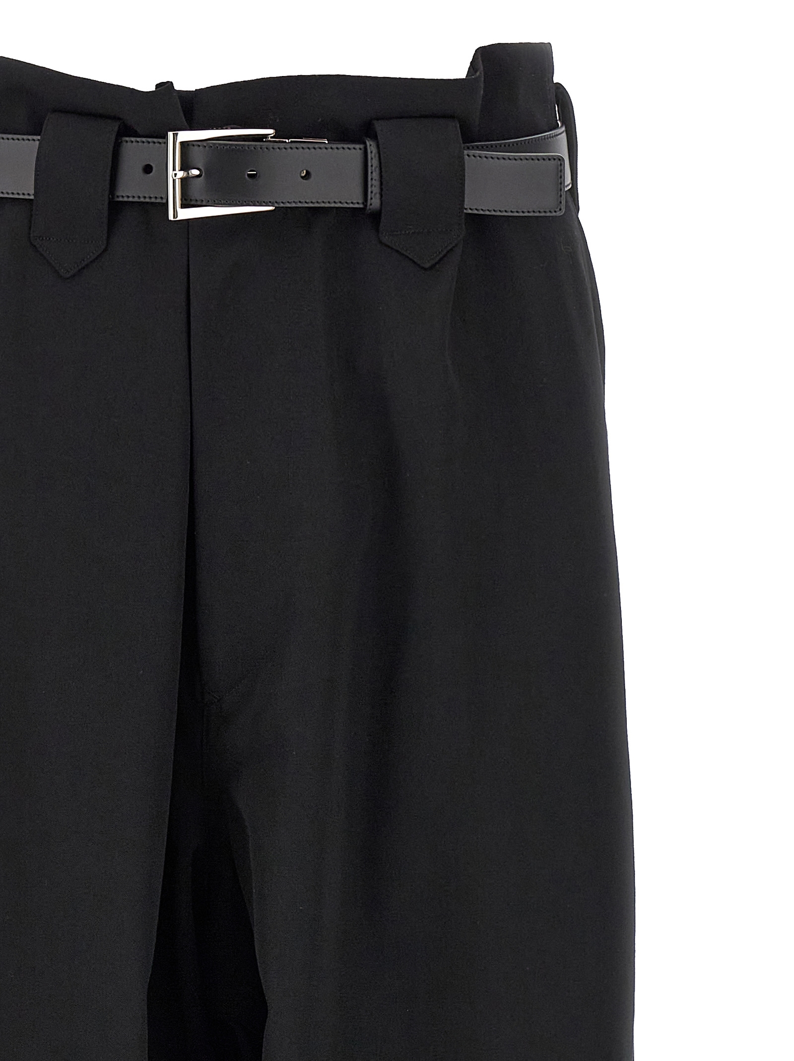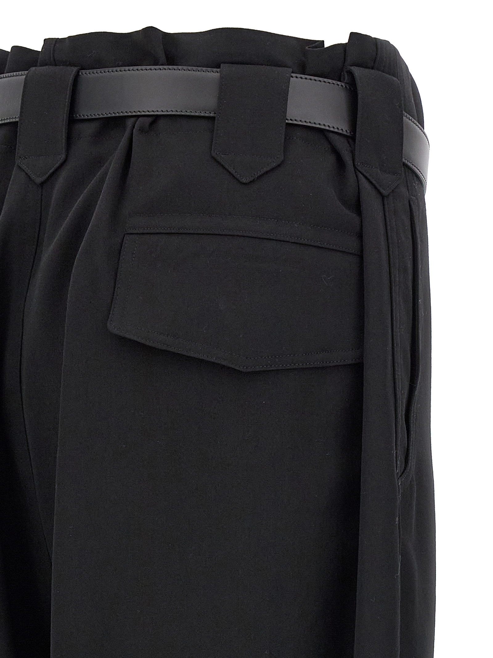 Wool gabardine trousers with low crotch, cargo pockets and wide leg, zip and front button closure, pockets.