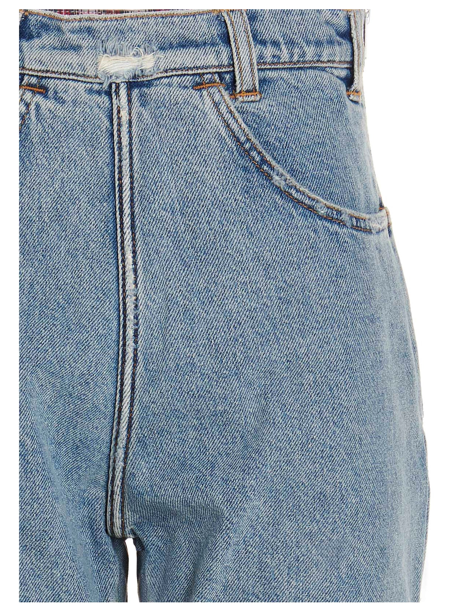 Denim jeans with a side zip, a logo embroidery, destroyed details, an insert with an inner check at the waist, splits at the bottom hem, a carrot fit.