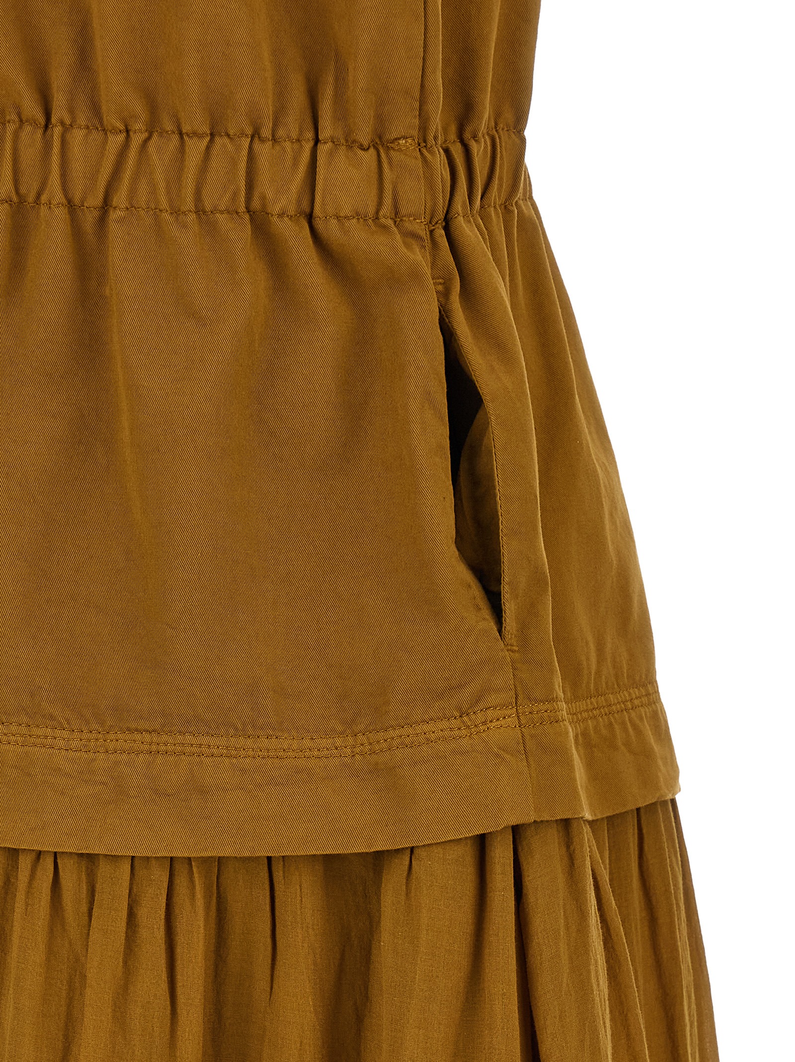 ‘Casarsa’ long dress consisting of garment-dyed cotton gabardine top, deep V-neck with tone-on-tone crossed ribbons on the front, sleeveless, elastic waistband and wide skirt in cotton voile with curled panels and flounce on the skirt bottom.