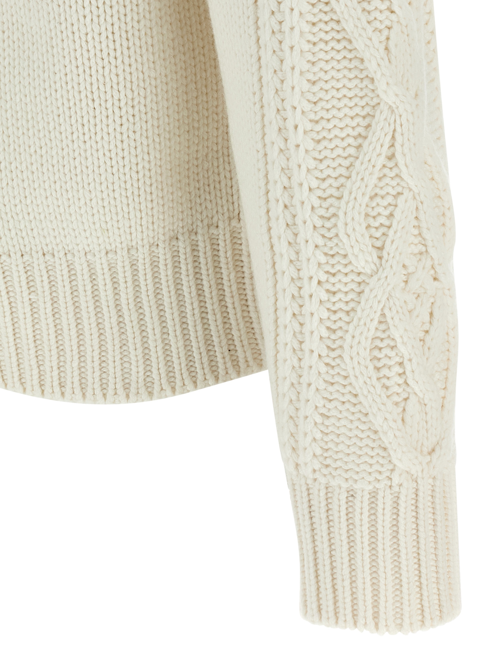 Cashmere knit cardigan with cable pattern, round neck with lapels and button, front closure with gold and logo buttons, long sleeves with cuffs.