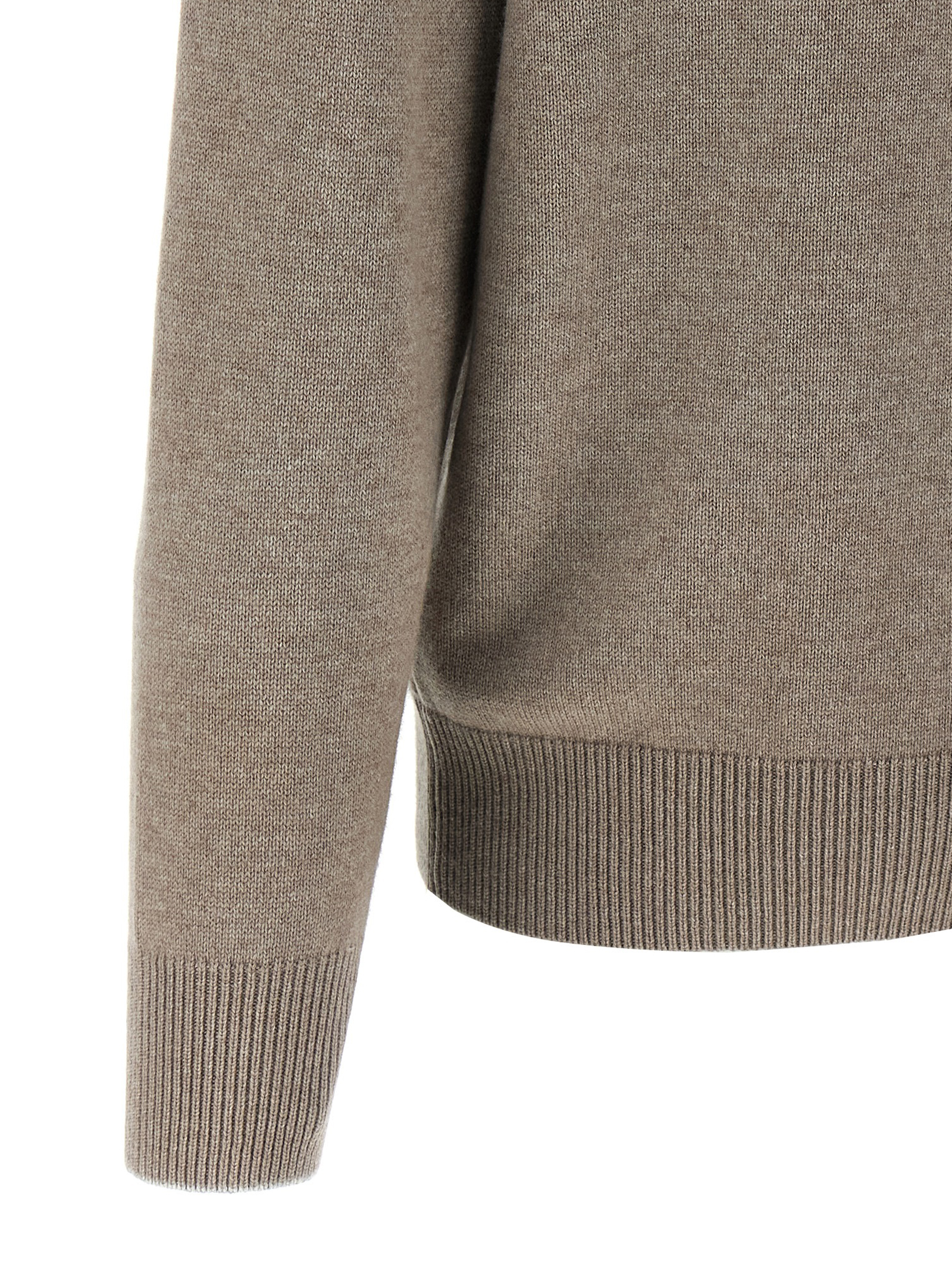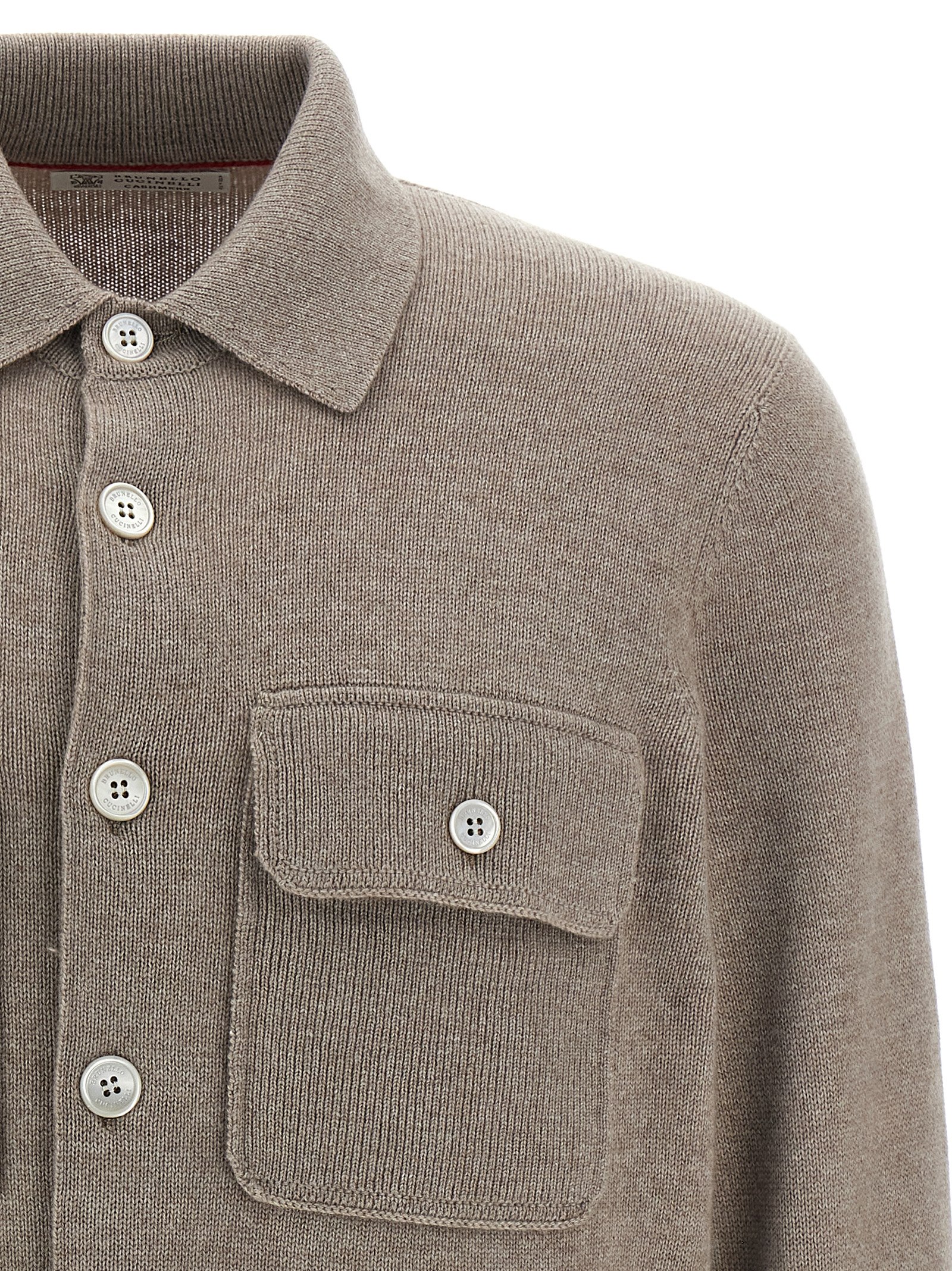 Cashmere cardigan with shirt collar, front button closure, pockets, long cuffed sleeves.