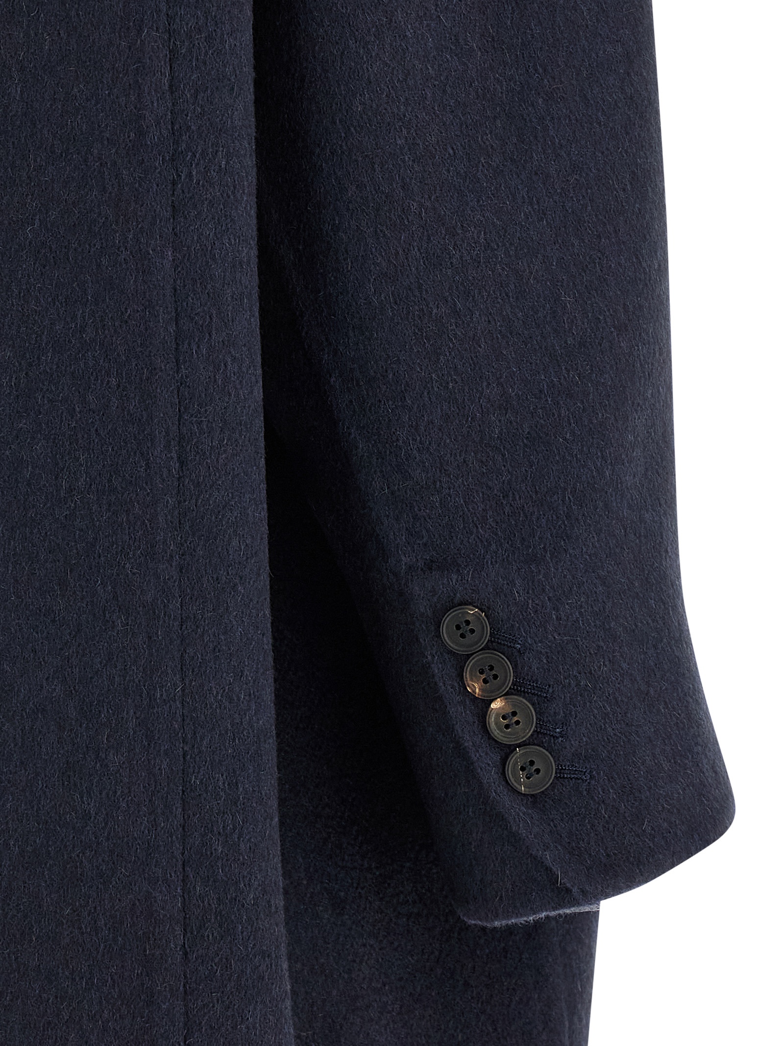 Cashmere coat, unlined, double-breasted with front button closure, peak lapels, pockets, long sleeves with dropped shoulders.