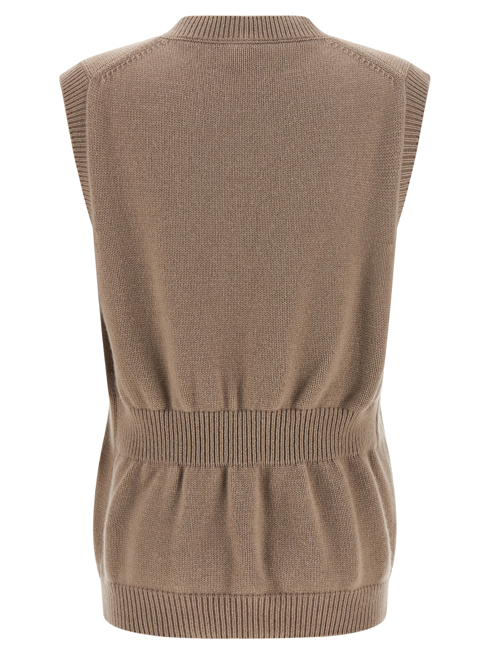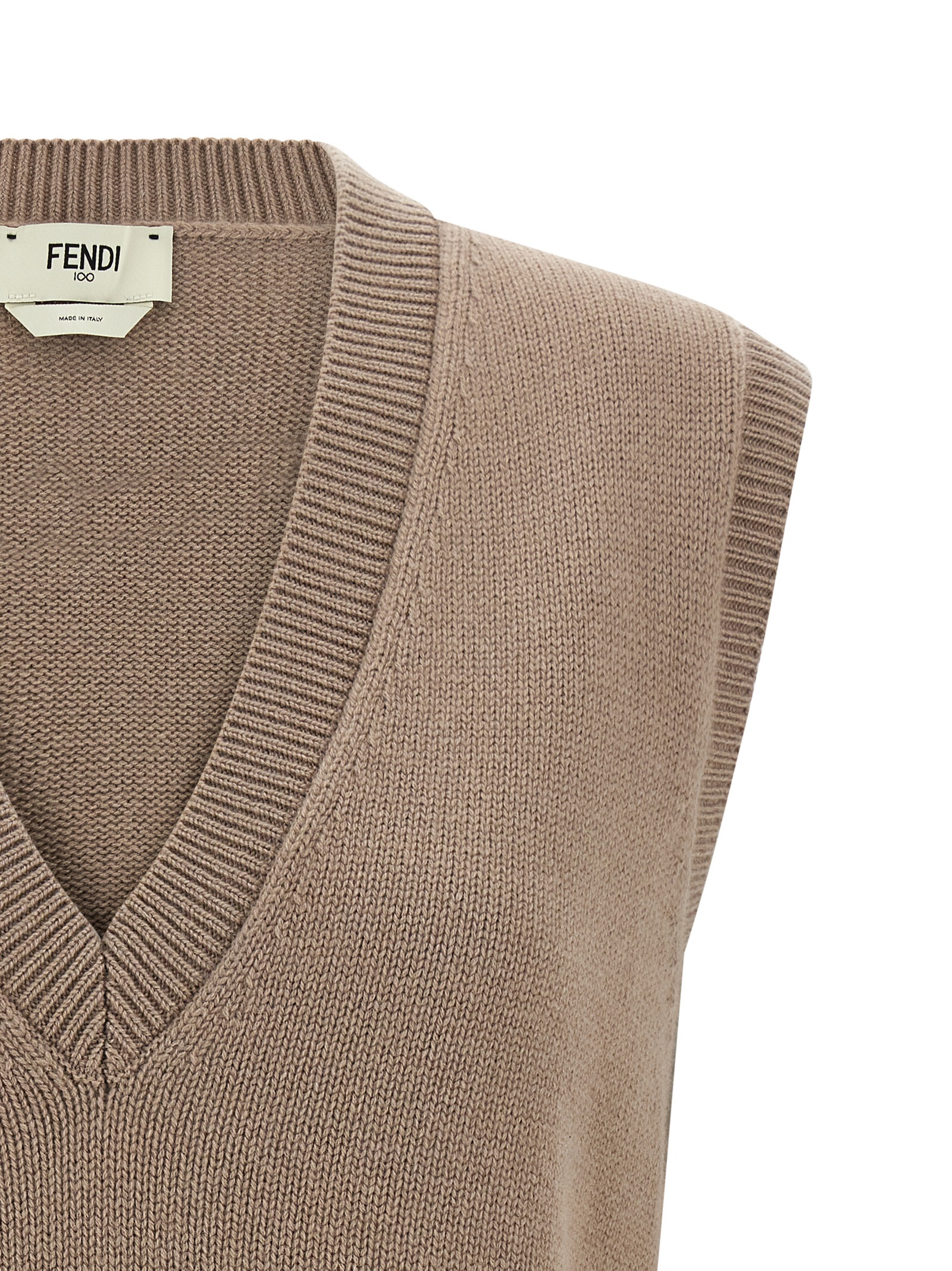 Cashmere vest with Fendi Roma logo embroidery on the front, ribbed elastic insert at the back waist, V-neck.