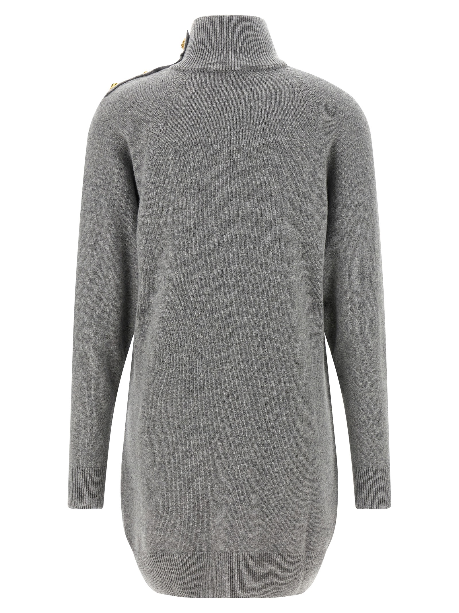 Wool and cashmere mini dress, high neck, metal ‘Testa di leone’ button detail on the left shoulder, long bat sleeves with cuffs.