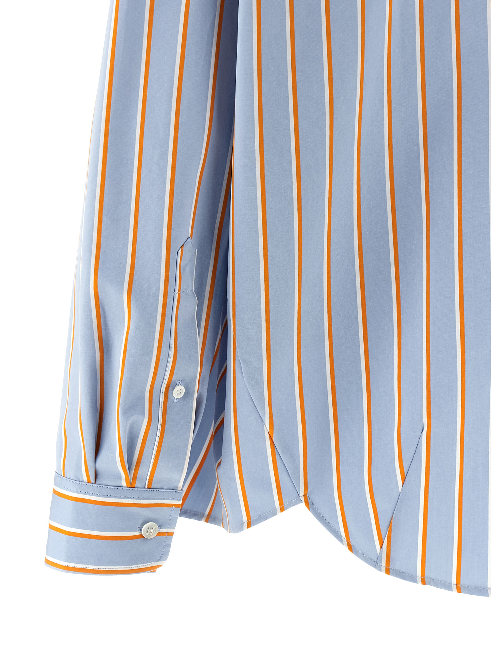 ‘Casia’ striped cotton shirt with front button closure, long sleeves with cuffs and dropped shoulders, asymmetrical hem.