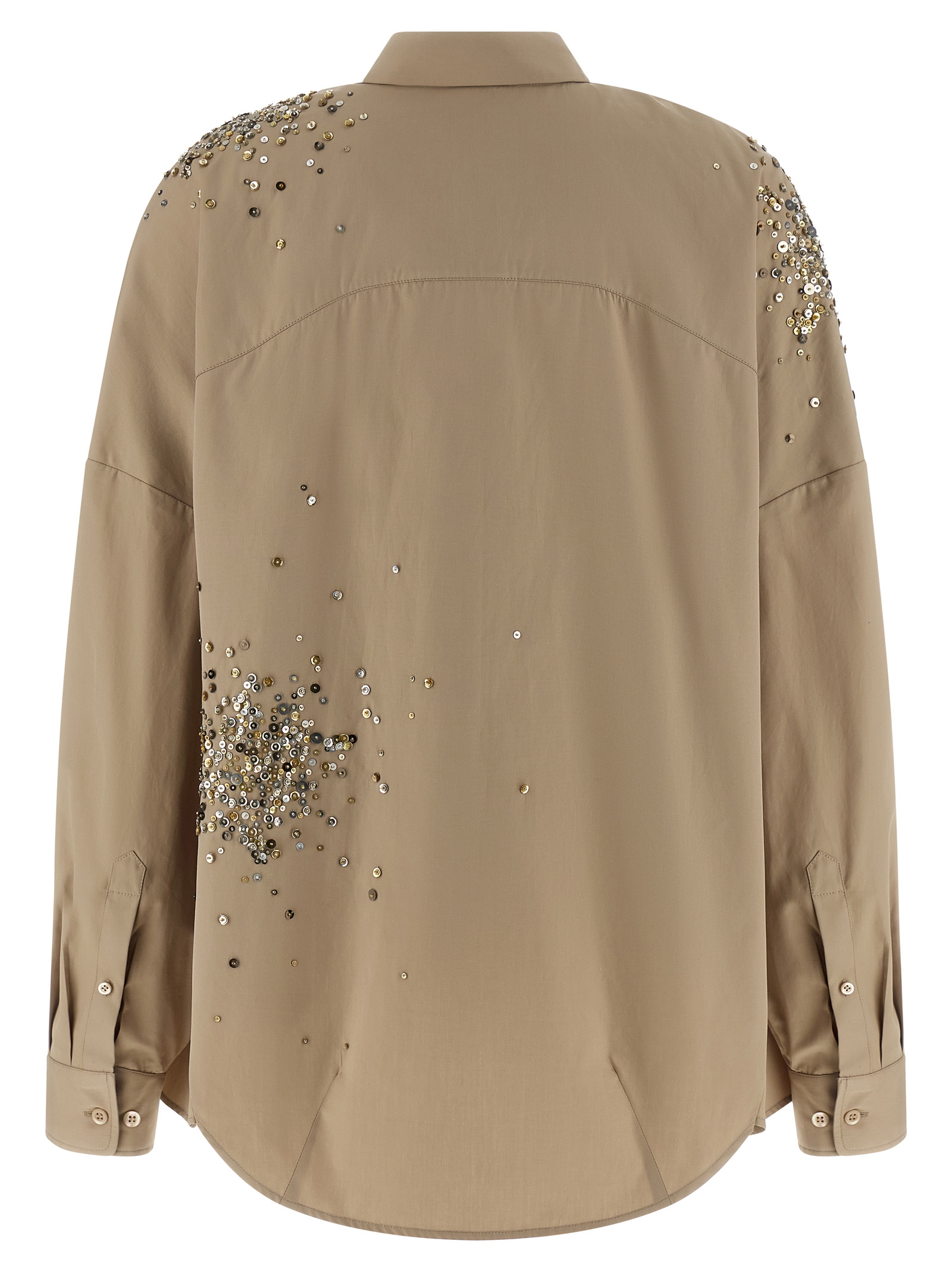 ‘Casia’ cotton poplin shirt with sequin appliqué on the front and back, front button closure, long sleeves with cuffs and dropped shoulders.