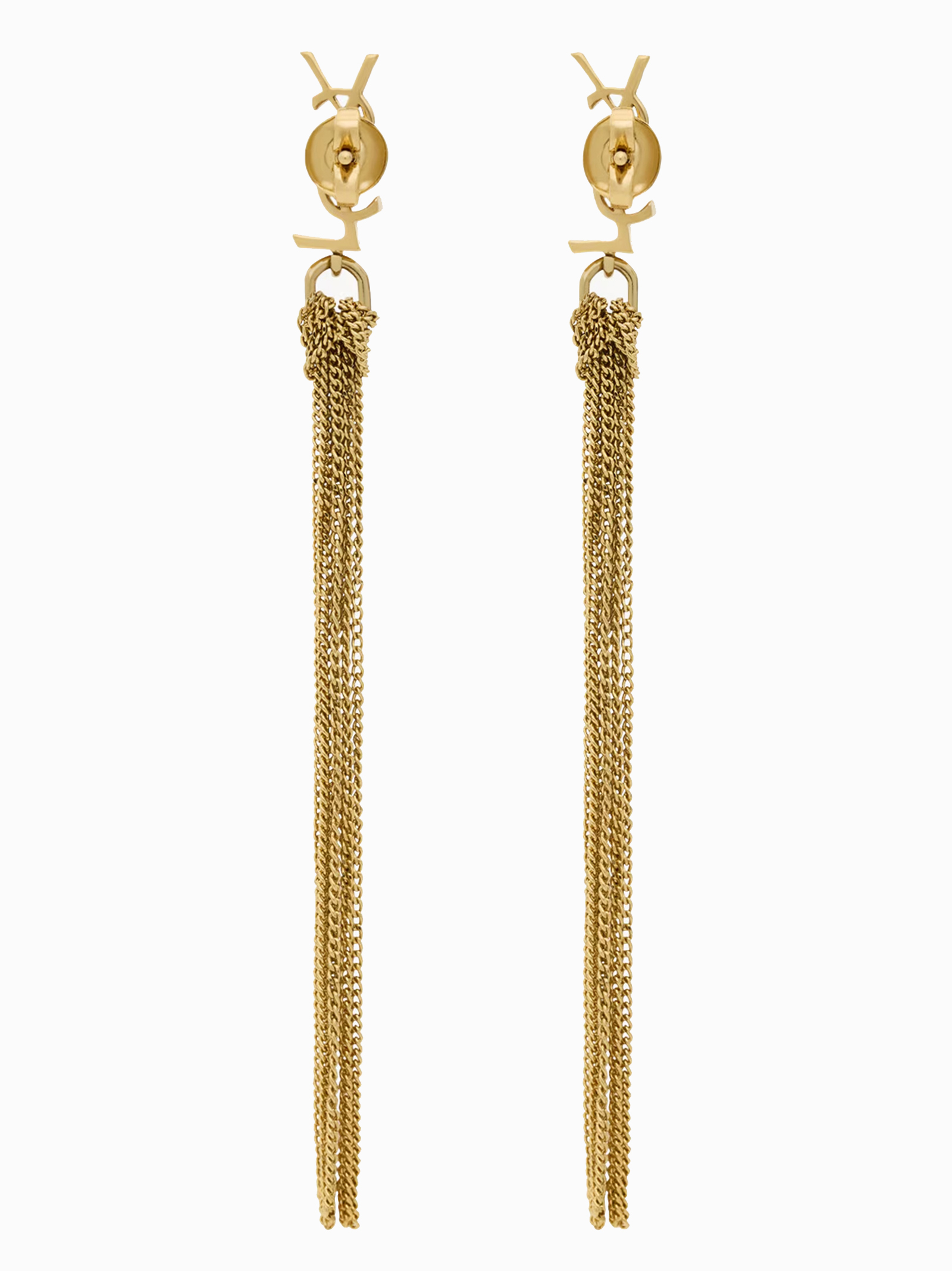 ‘Cassandre’ earrings with logo and tassels in barbazzale chain.