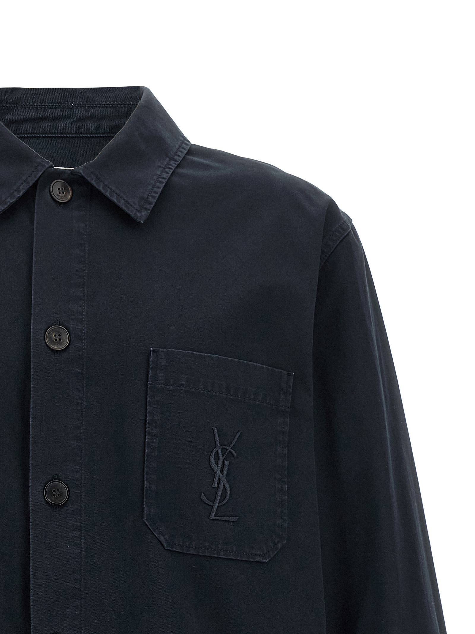 Cotton overshirt with pointed collar, breast pocket with tone-on-tone ‘Cassandre’ embroidered logo, front horn button closure, long sleeves with cuffs and slightly dropped shoulder, side slits on the hem.