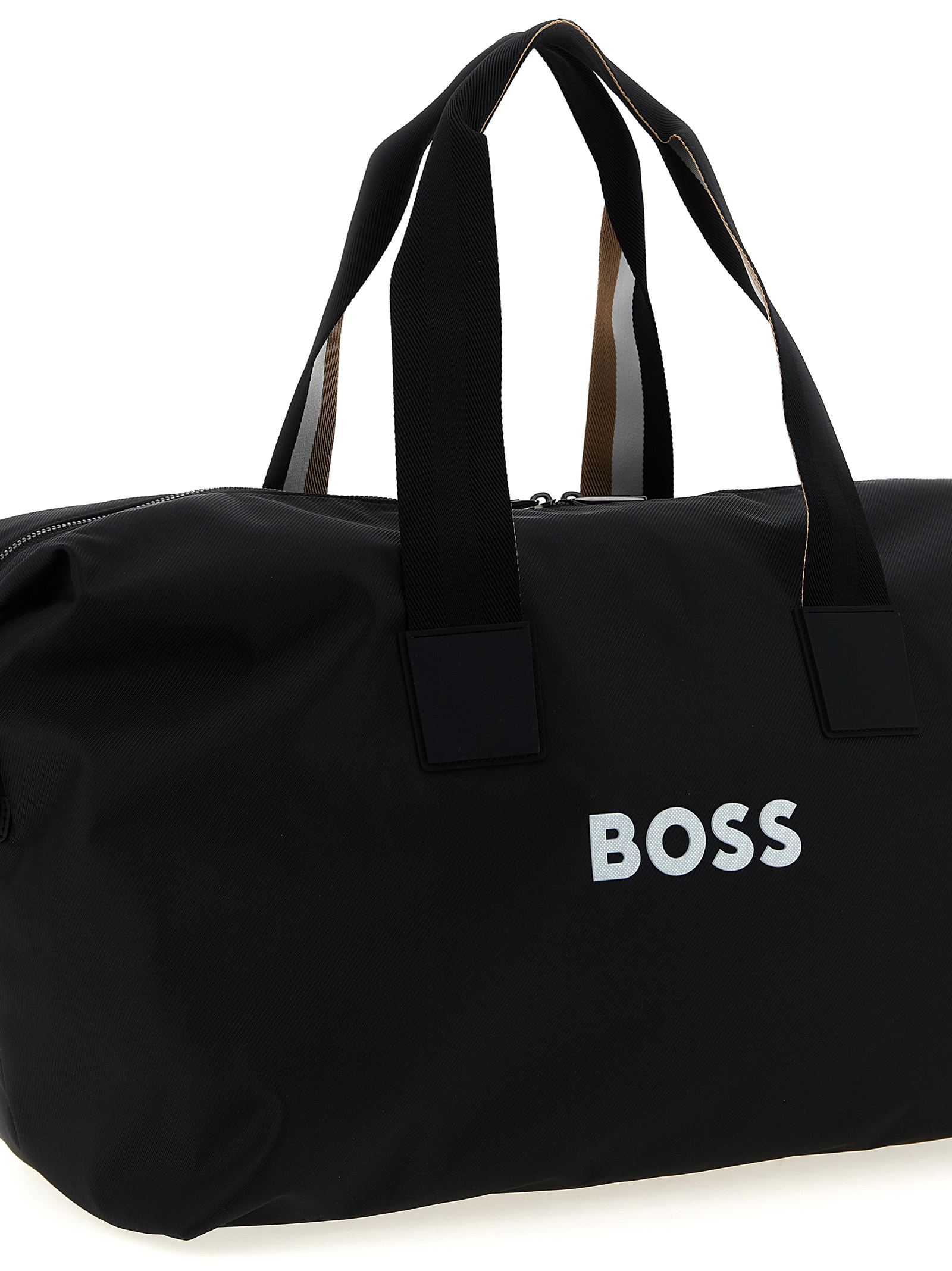 Catch 3.0′ synthetic fabric duffel bag with diagonal weave, front 3D logo, double fixed fabric handle, top zip closure, adjustable and removable shoulder strap.