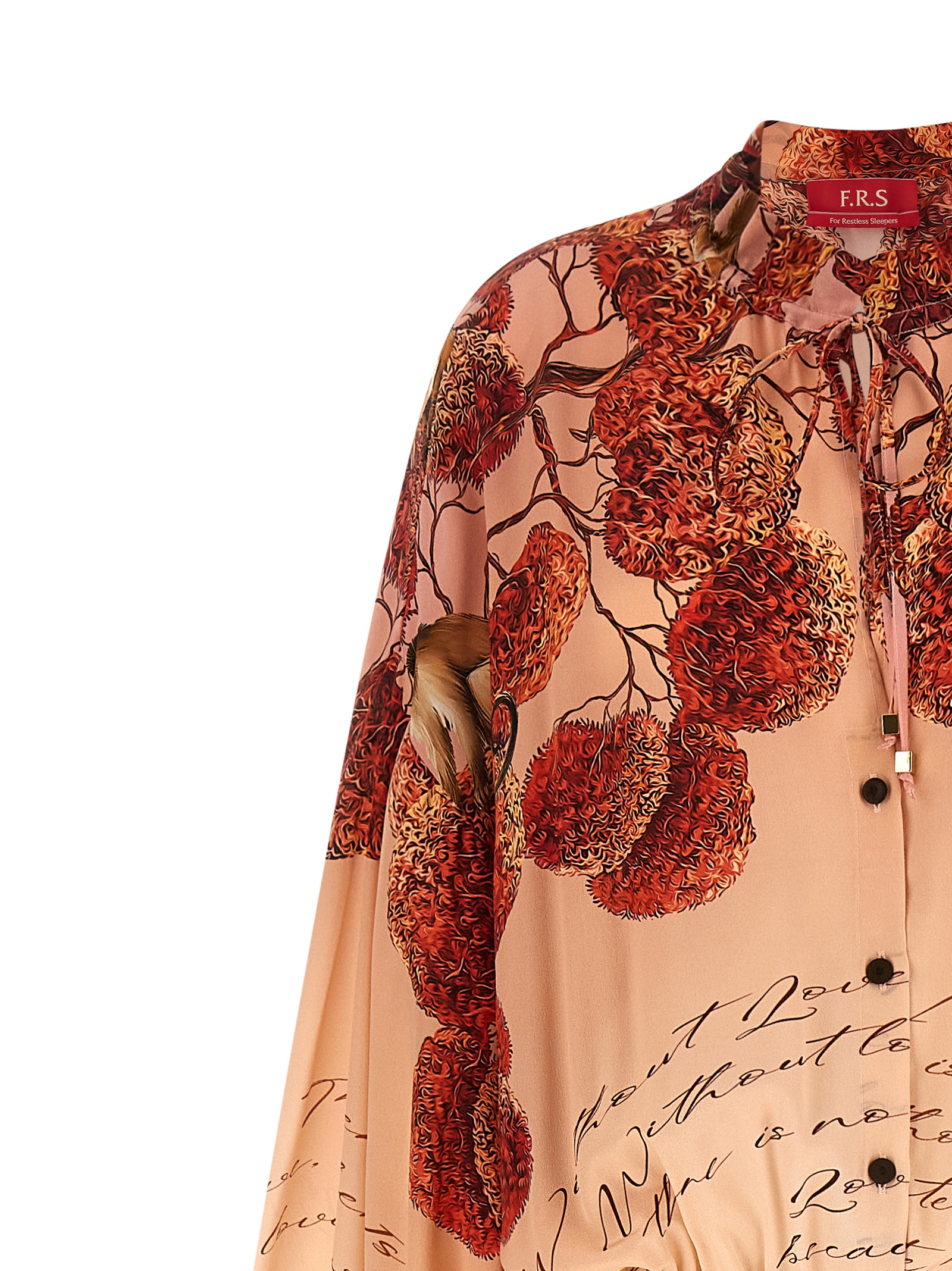 ‘Cenide’ long dress in ‘Contemplating Love Pink’ print silk crêpe, chemisier model, Korean collar with drawstring, front button closure, long wide balloon sleeves with elastic cuffs, drawstring at the waist.