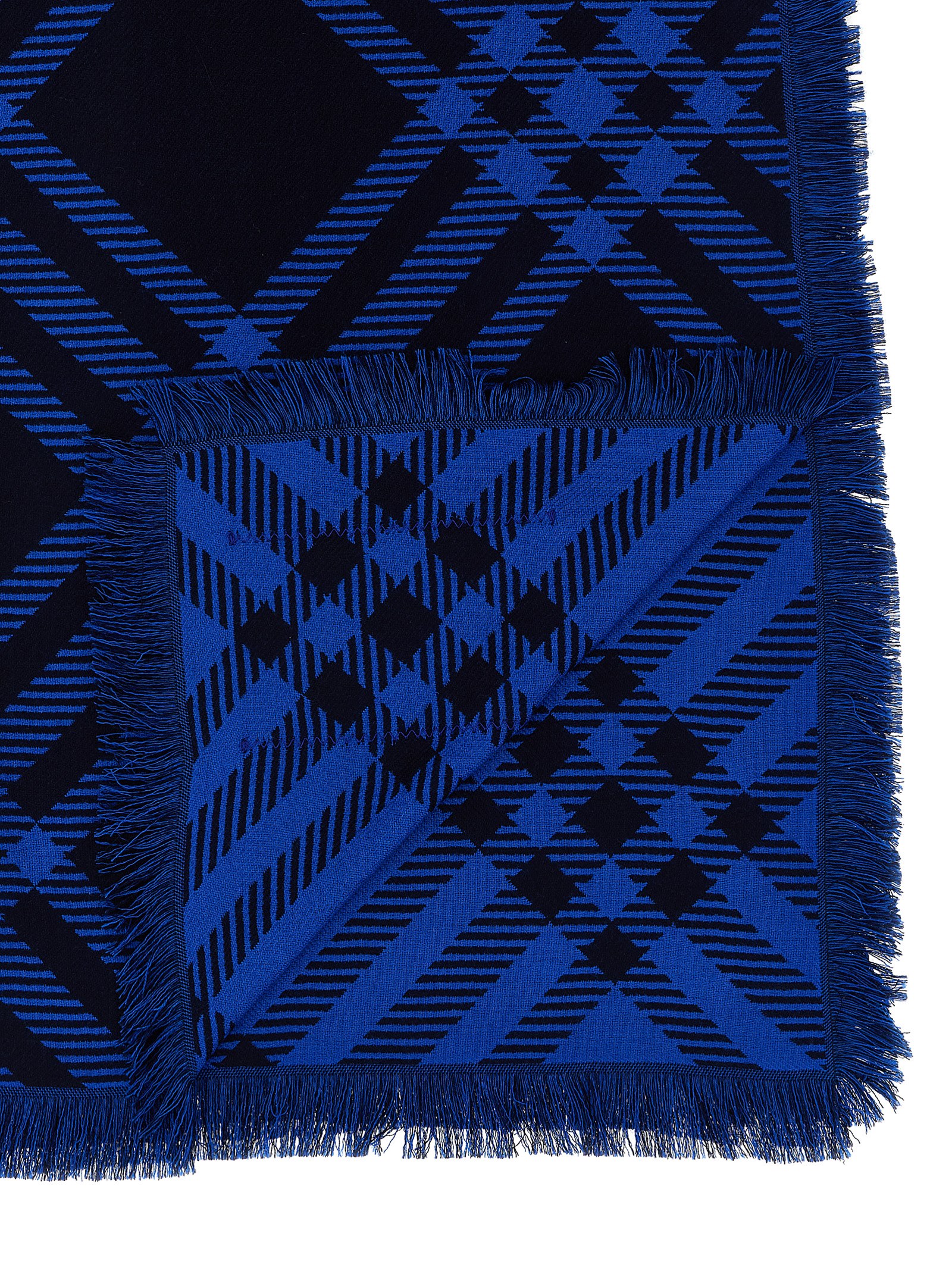 Wool and silk blend scarf woven with check pattern, double-face, ‘Equestrian Knight Design’ patch, fringed edges.