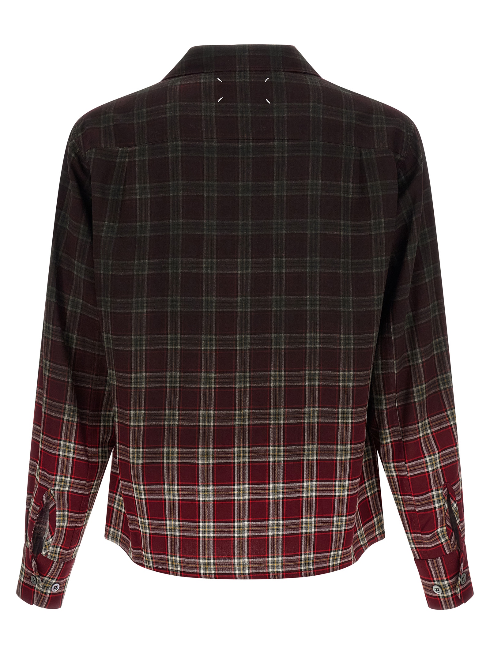 Check patterned viscose rayon shirt with gradient effect overprinted with spray pigment, straight silhouette, pockets, front mother-of-pearl button closure, long sleeves with cuffs and dropped shoulder.