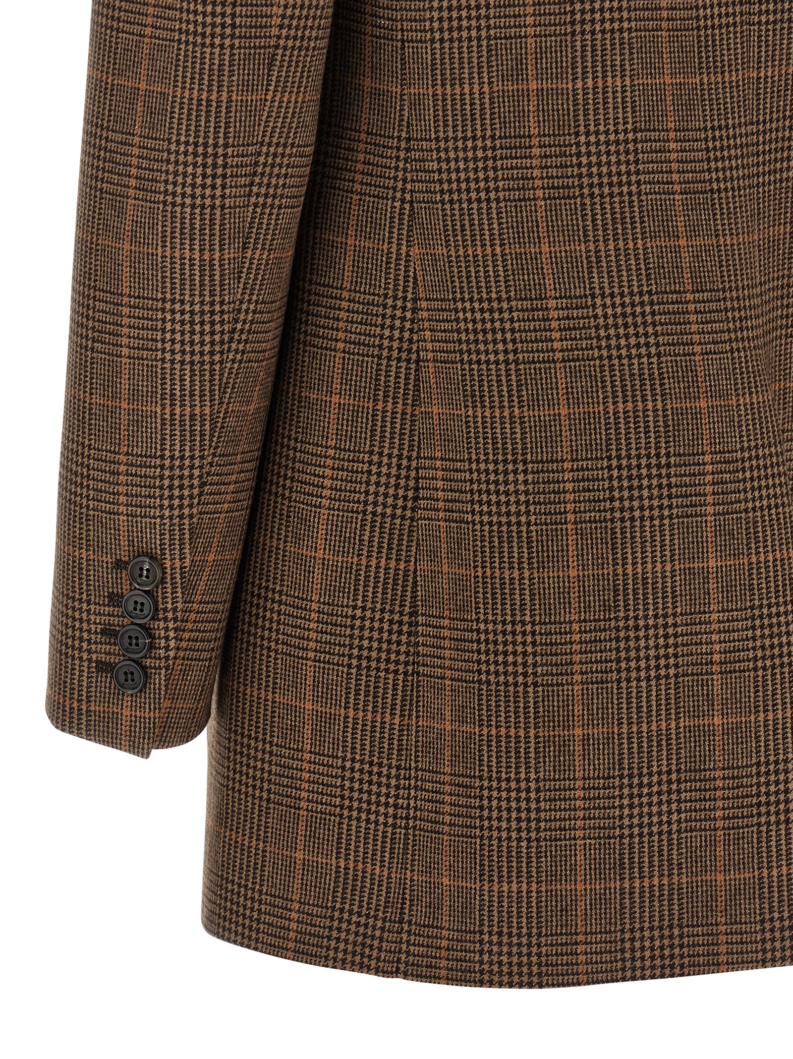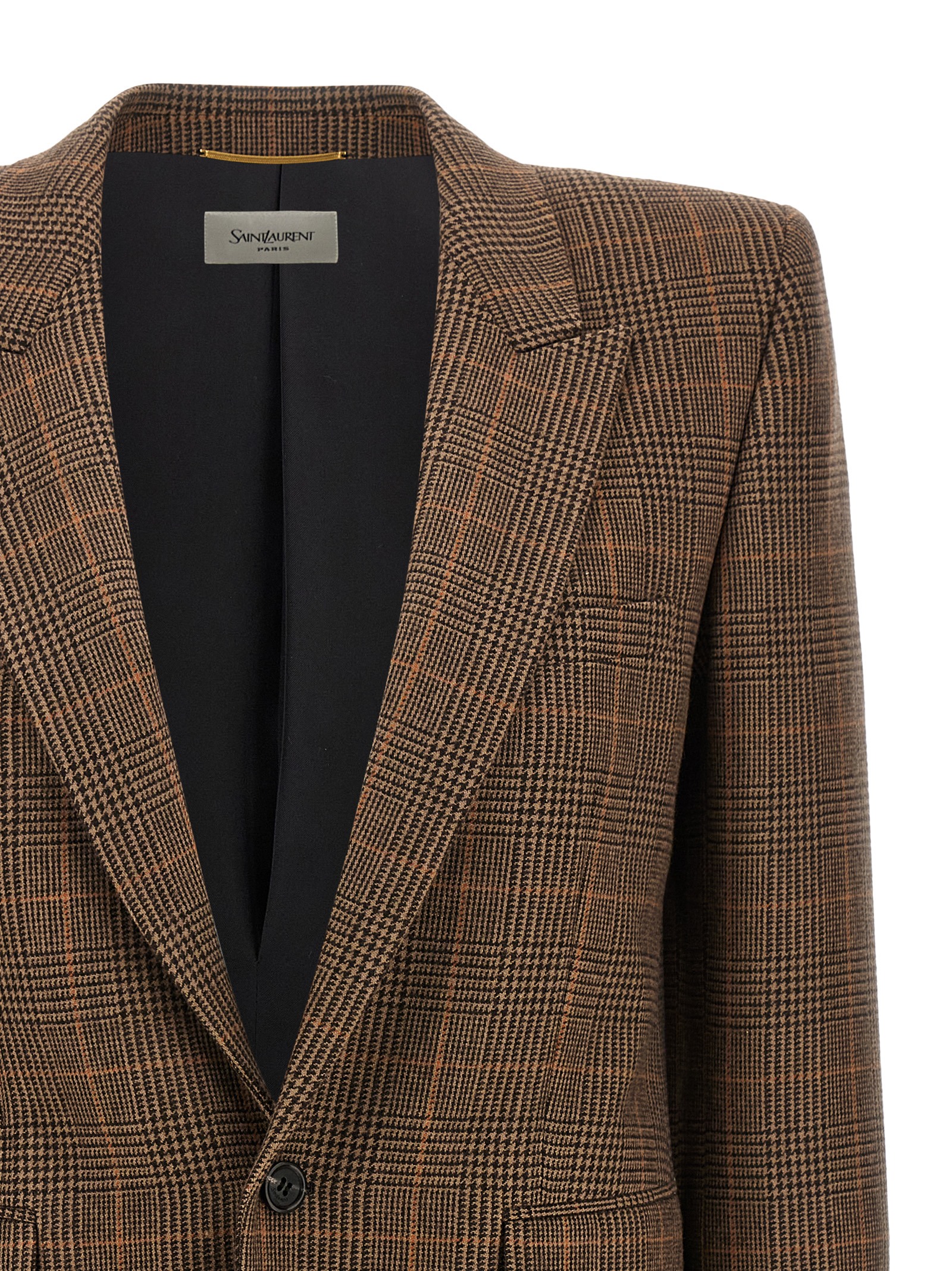 Check wool single-breasted blazer with front button closure, peak lapels, chest pocket, flap pockets, padded shoulder strap, long sleeves, back split, silk lining.