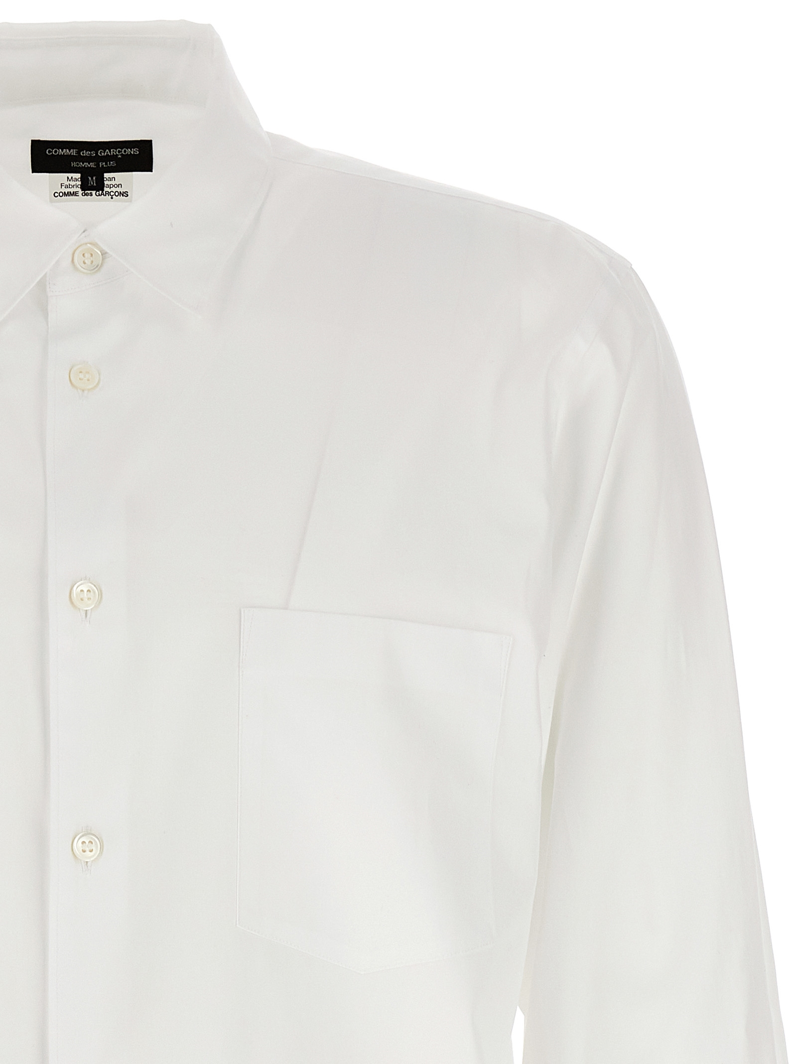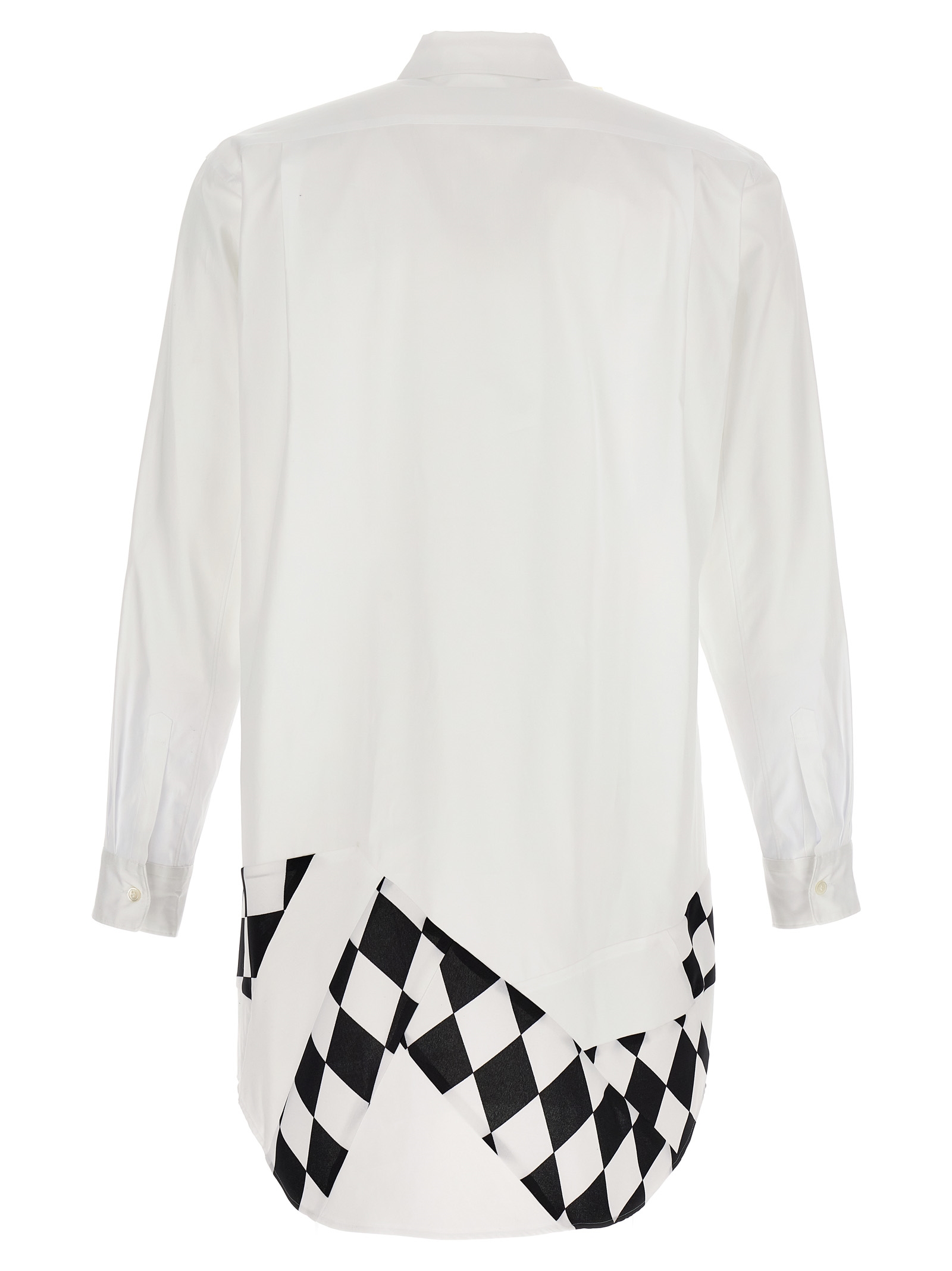 Cotton shirt with checkerboard print patchwork inserts, front pocket, a button closure, and long cuffed sleeves.