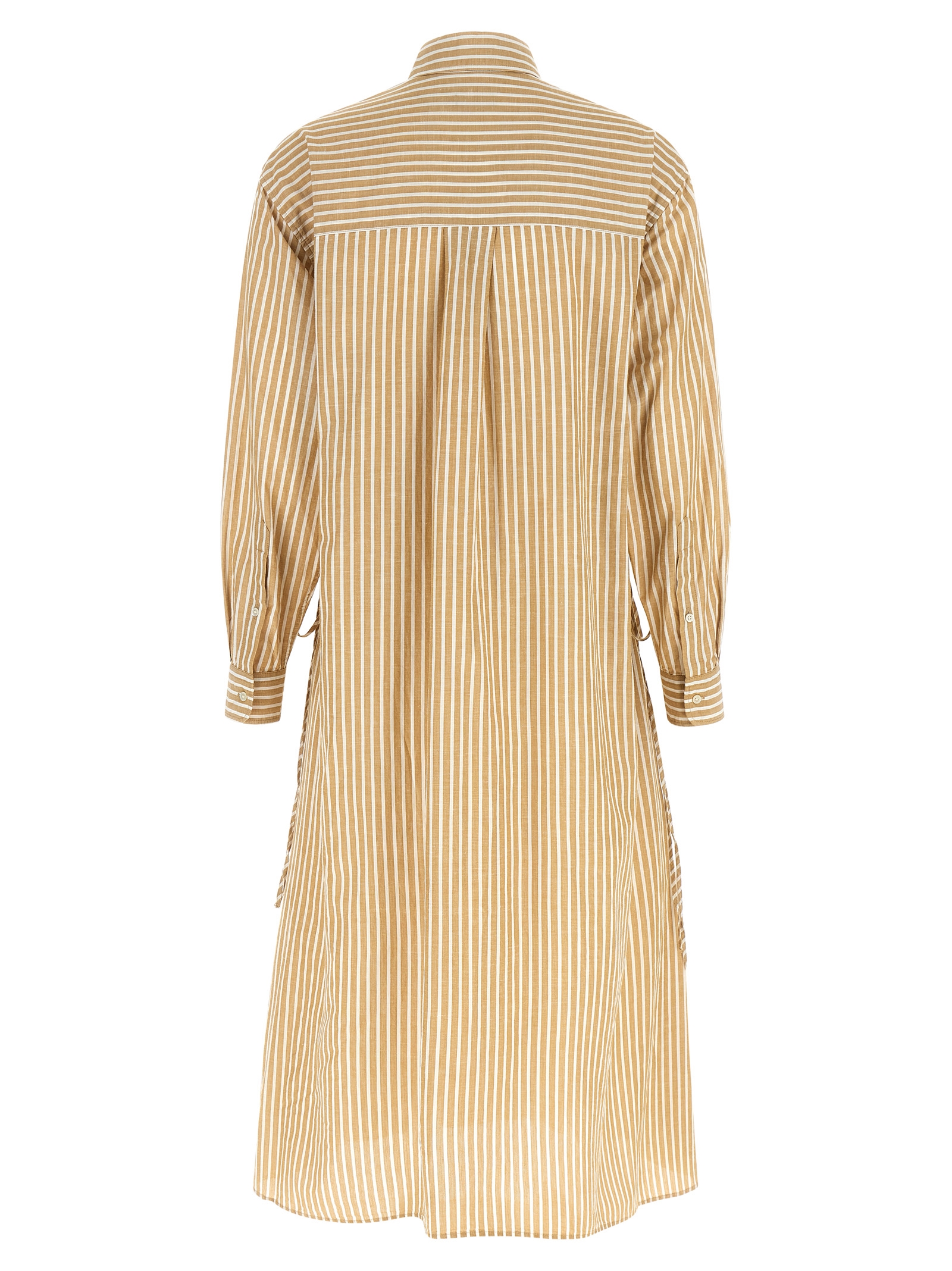Striped cotton and linen midi dress with chemisier style, trapeze silhouette, concealed front button closure, front drawstring at the waist, long cuffed sleeves, side slits.
