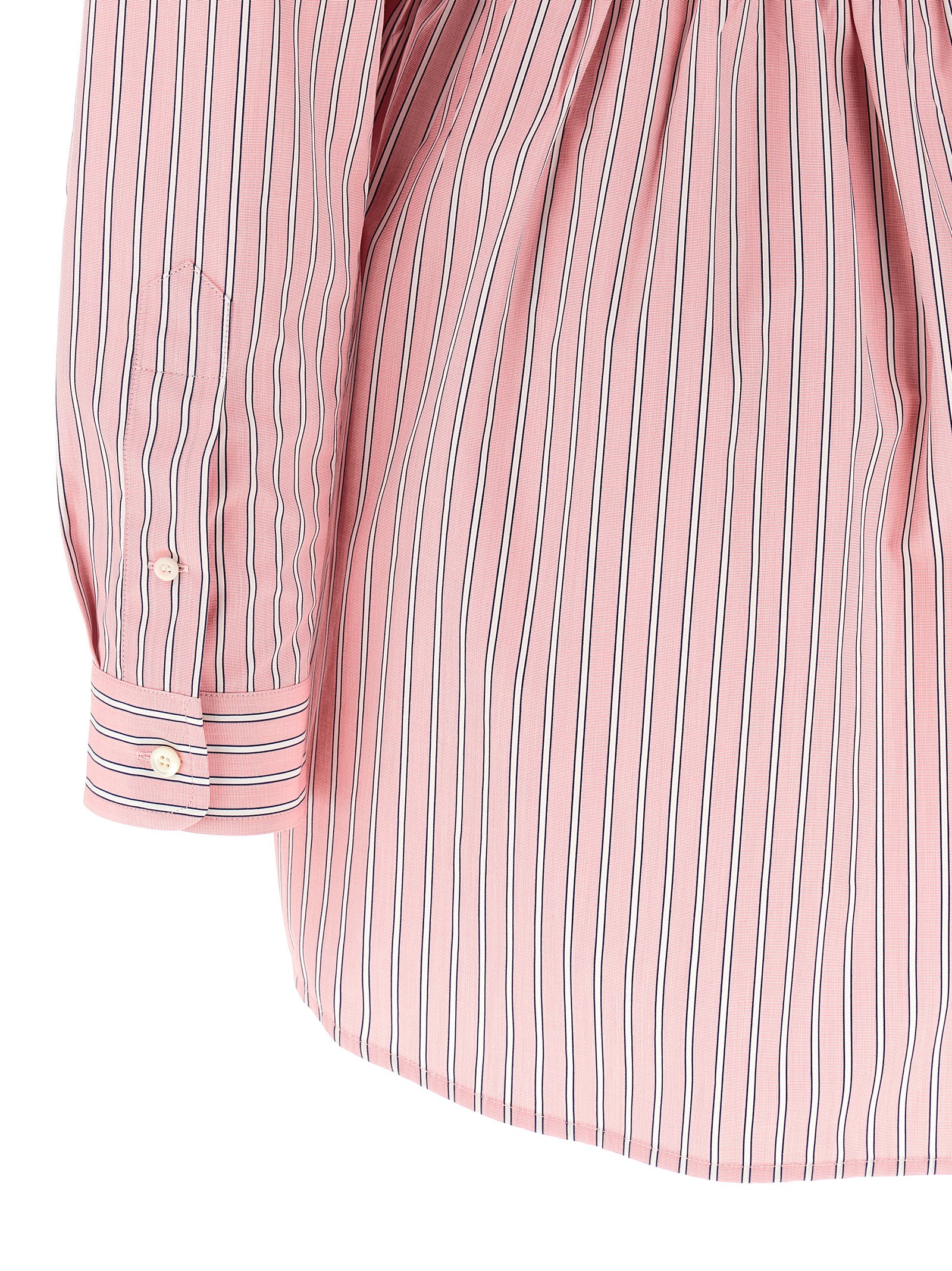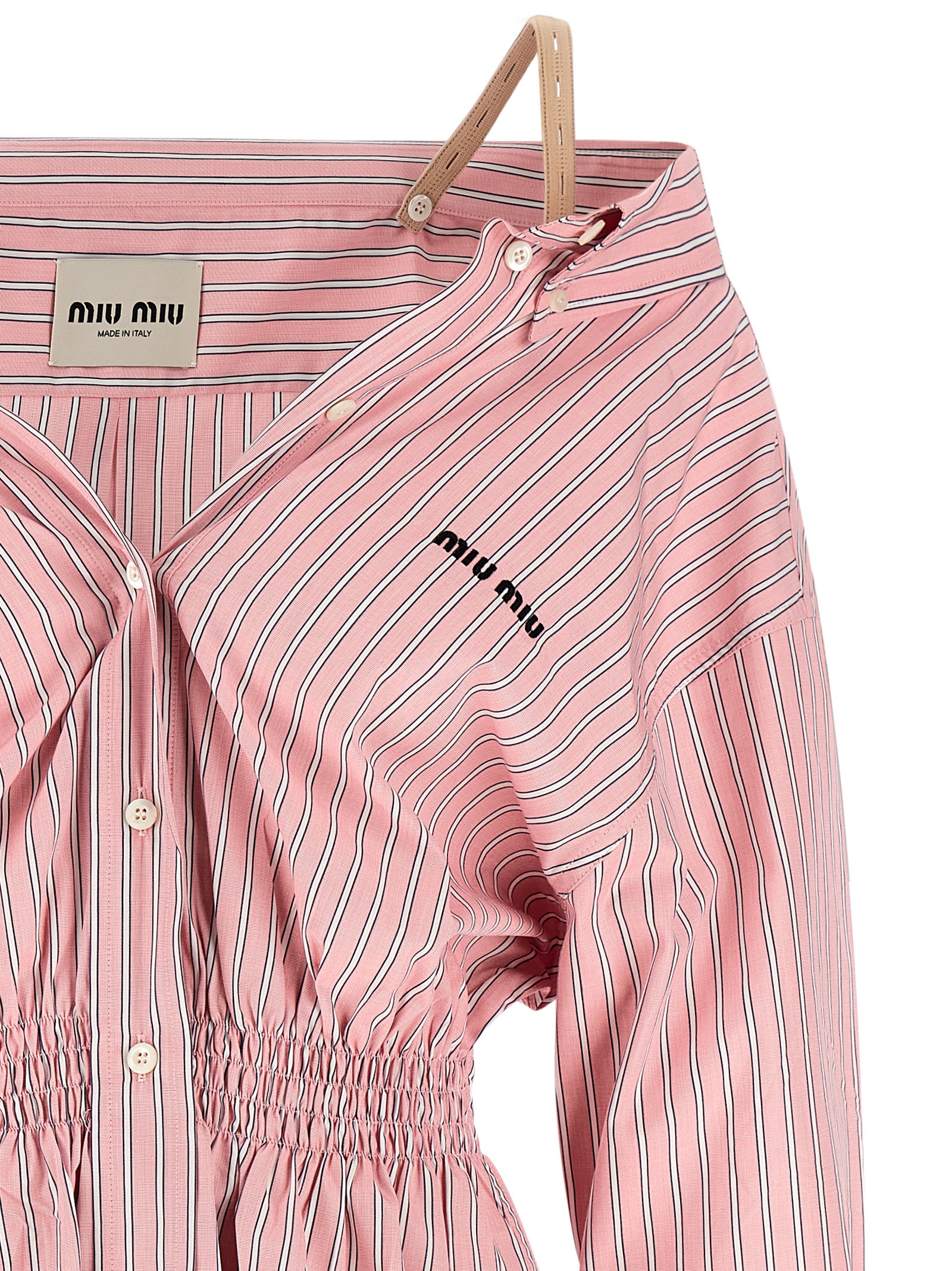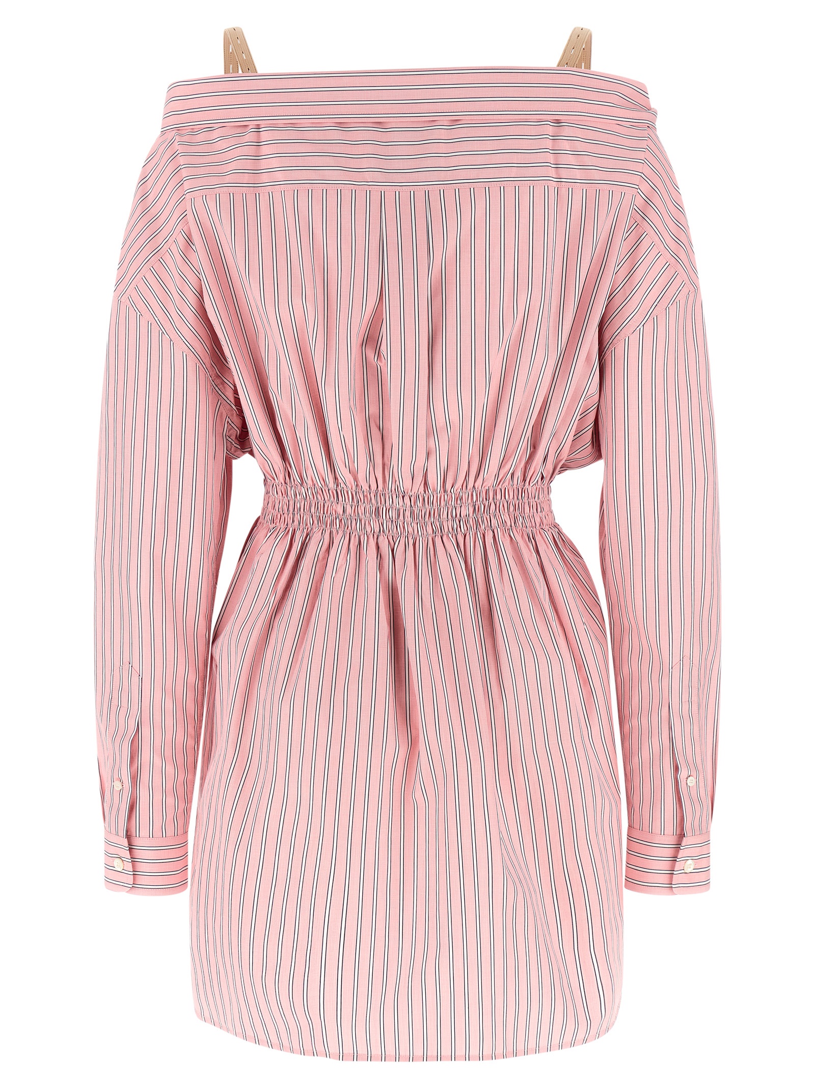 Striped cotton poplin mini dress, off-the-shoulder shirt style, adjustable and removable braces, logo embroidery and front button closure, smock stitching at the waist, long sleeves with cuffs.