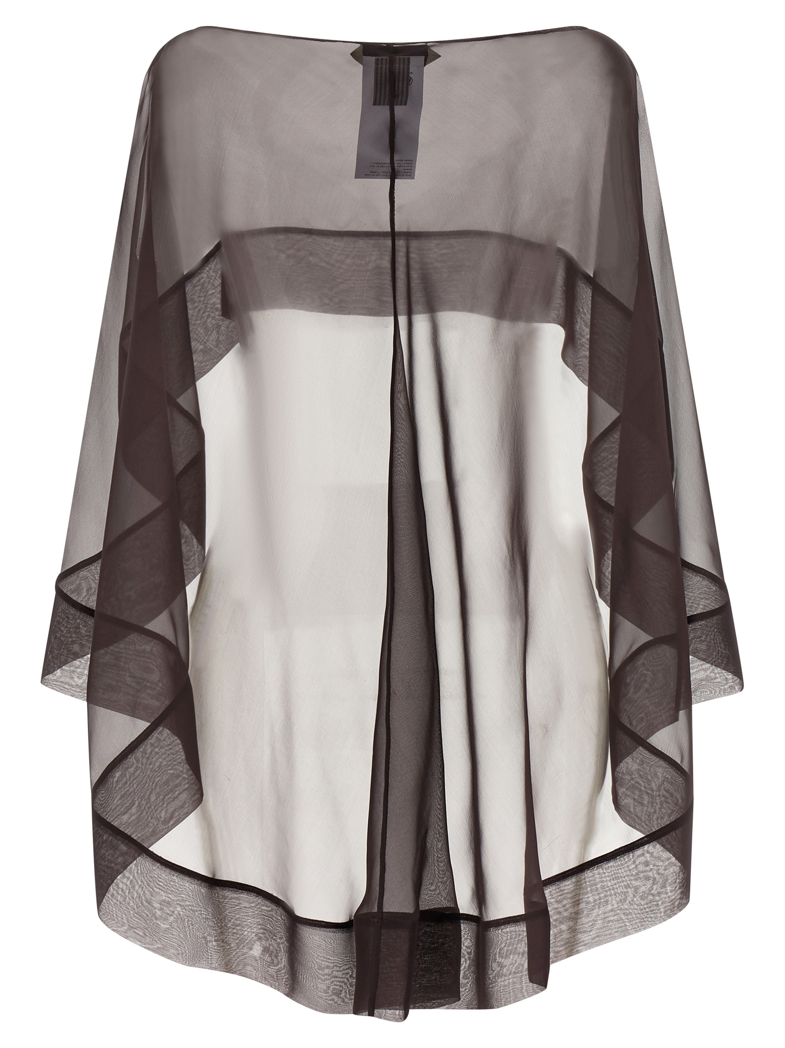 Semi-transparent silk chiffon scarf, hood style with boat neckline and asymmetric hem.