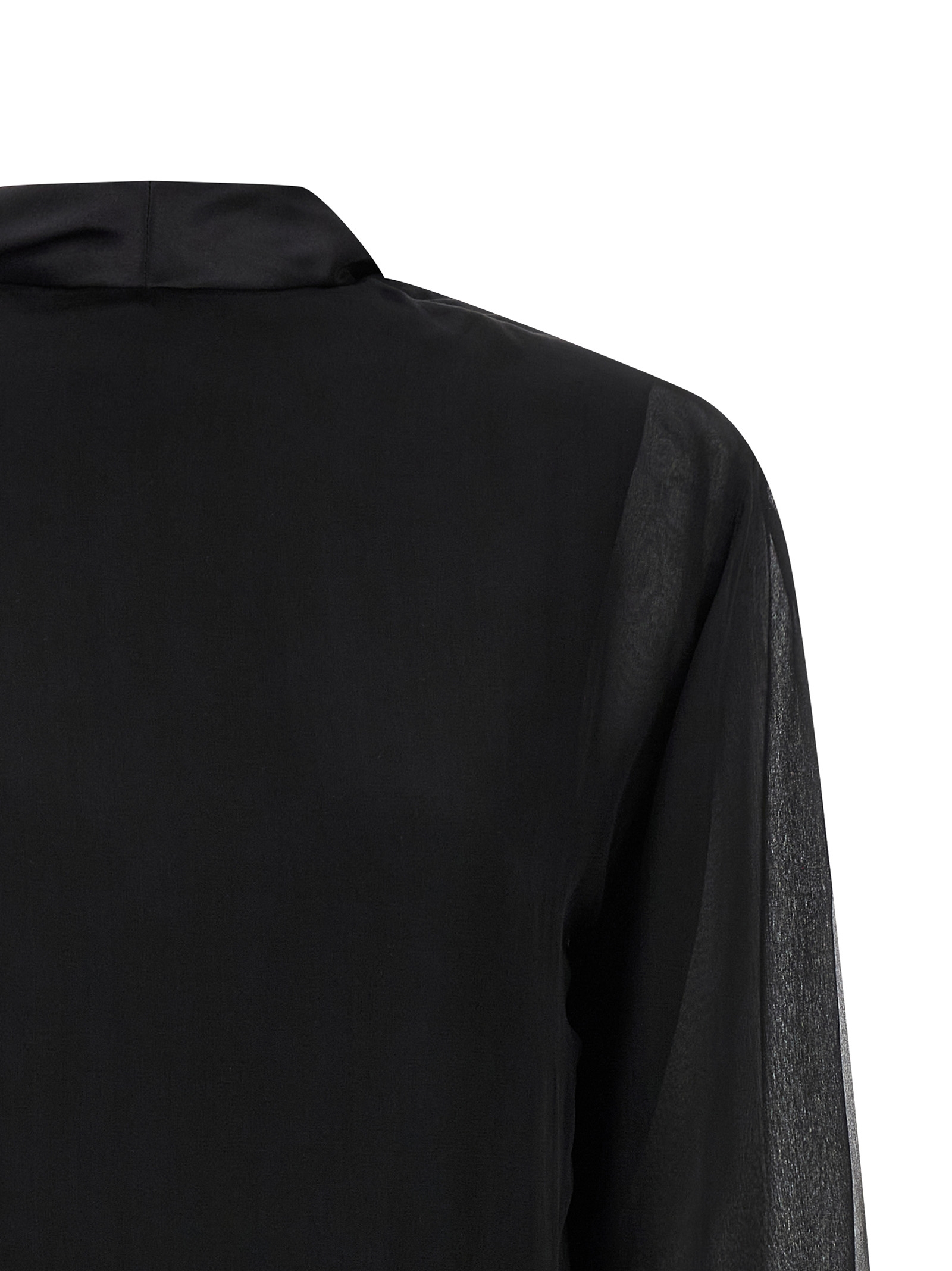 Reversible silk shiffon shirt with back and front neckline, crossed two-button closure, semi-transparent curled long sleeves.