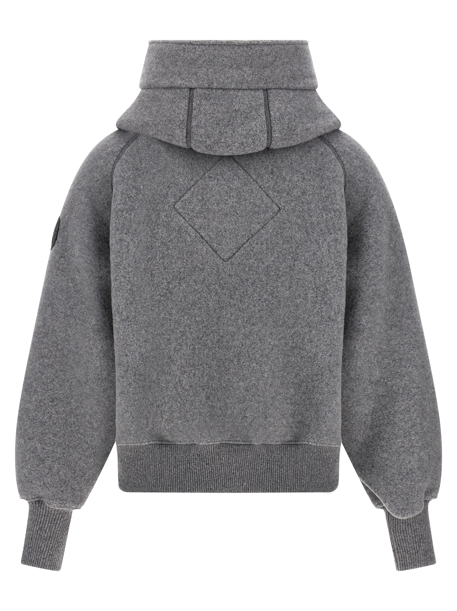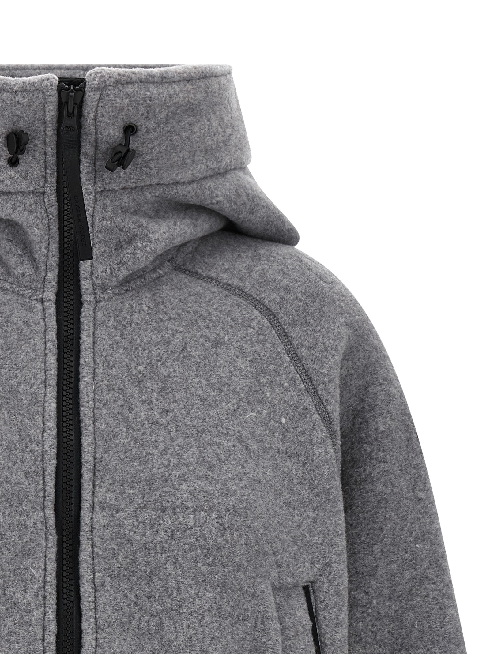 ‘ChilliWack’ bomber jacket with thick fleece hood, zip closure, side logo patch, pockets, long cuffed sleeves and knitted hem.