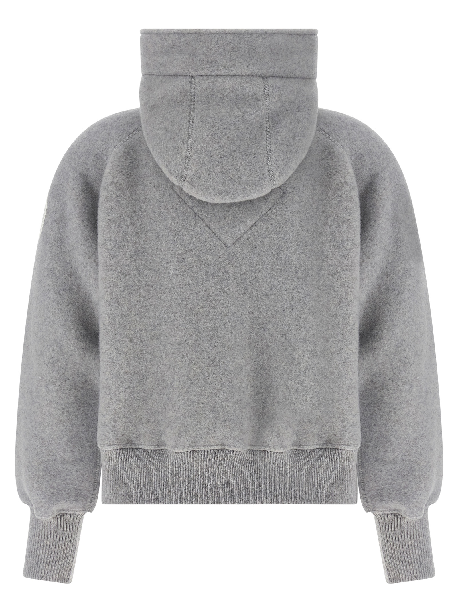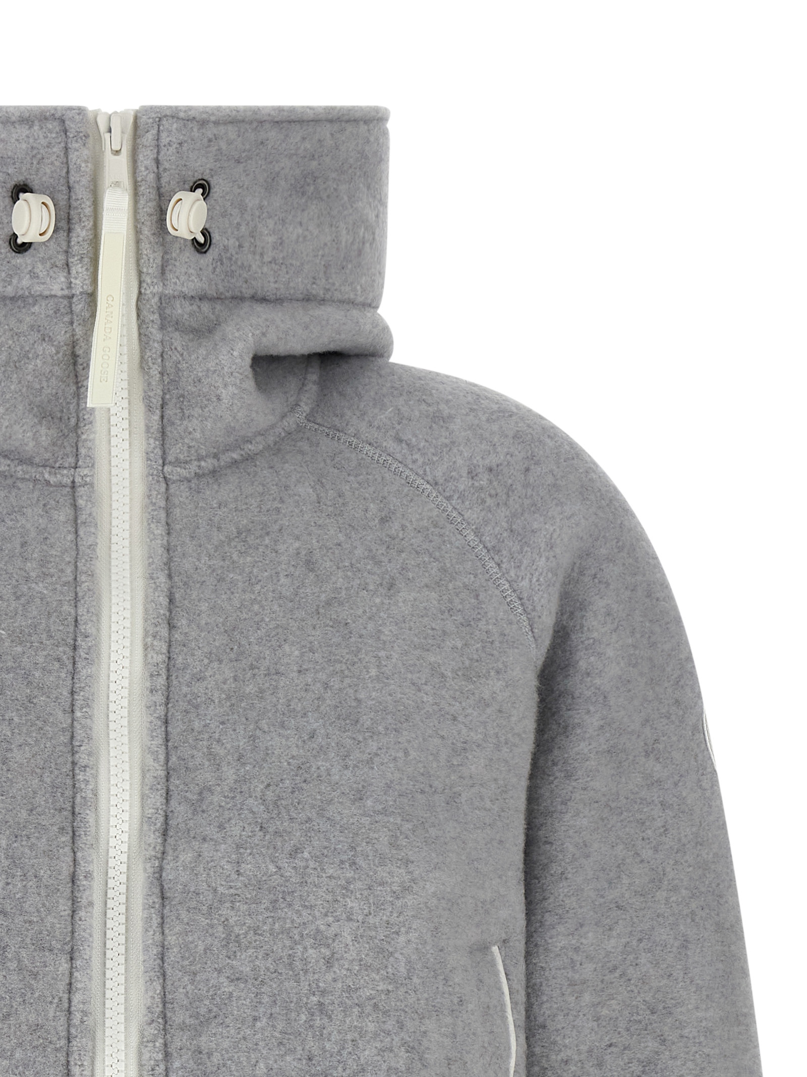 ‘ChilliWack’ bomber jacket with thick fleece hood, zip closure, side logo patch, pockets, long cuffed sleeves and knitted hem.