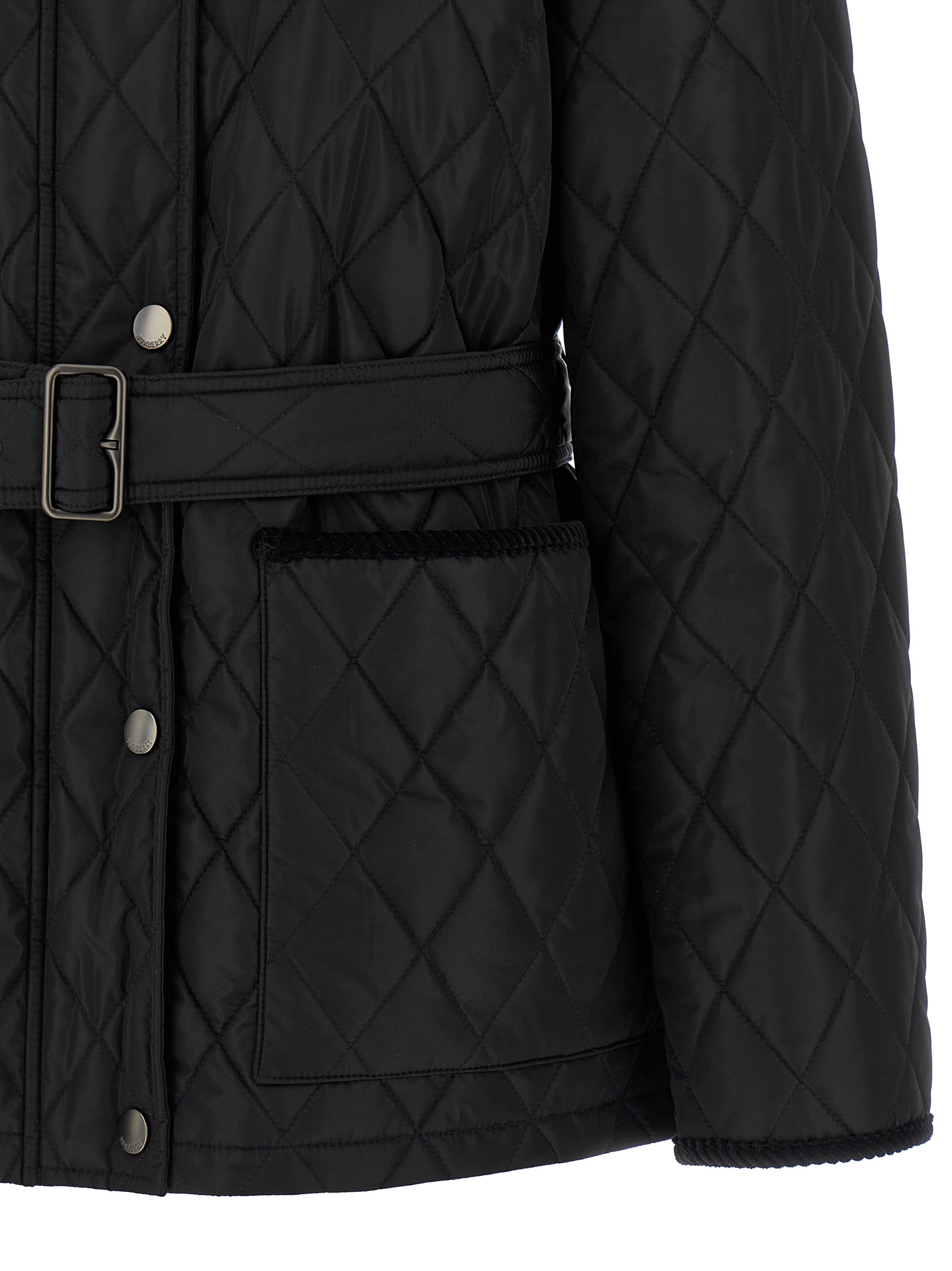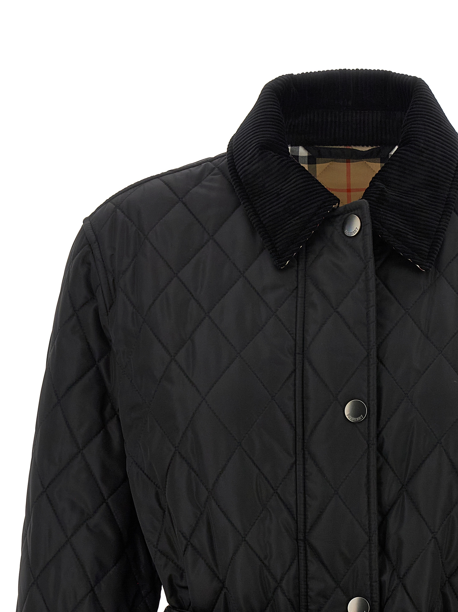 ‘Chiltern’ light nylon quilted jacket with corduroy details, Burberry Check cotton twill lining, shirt collar, front snap button closure, pockets, long sleeves, adjustable and removable belt.