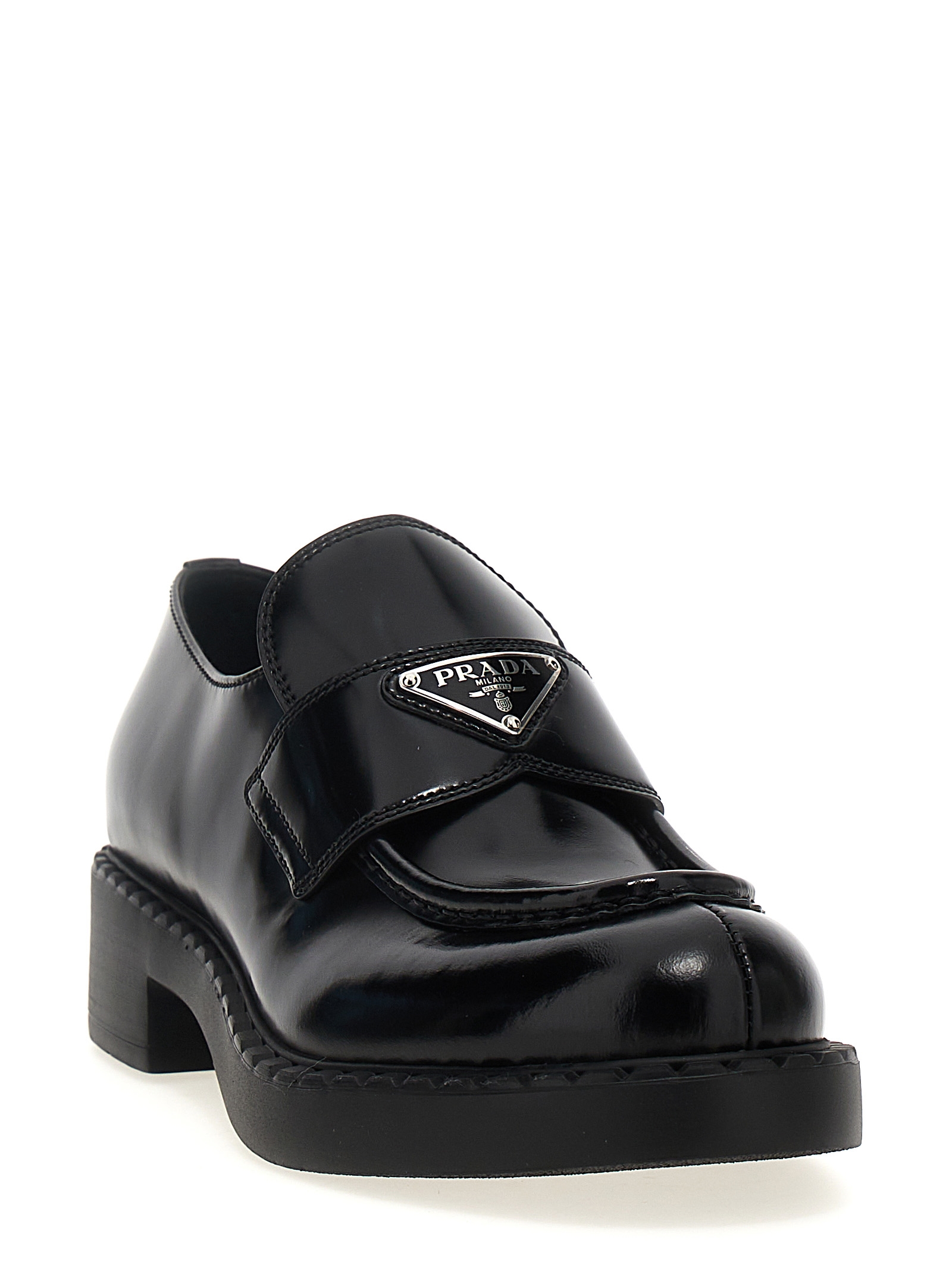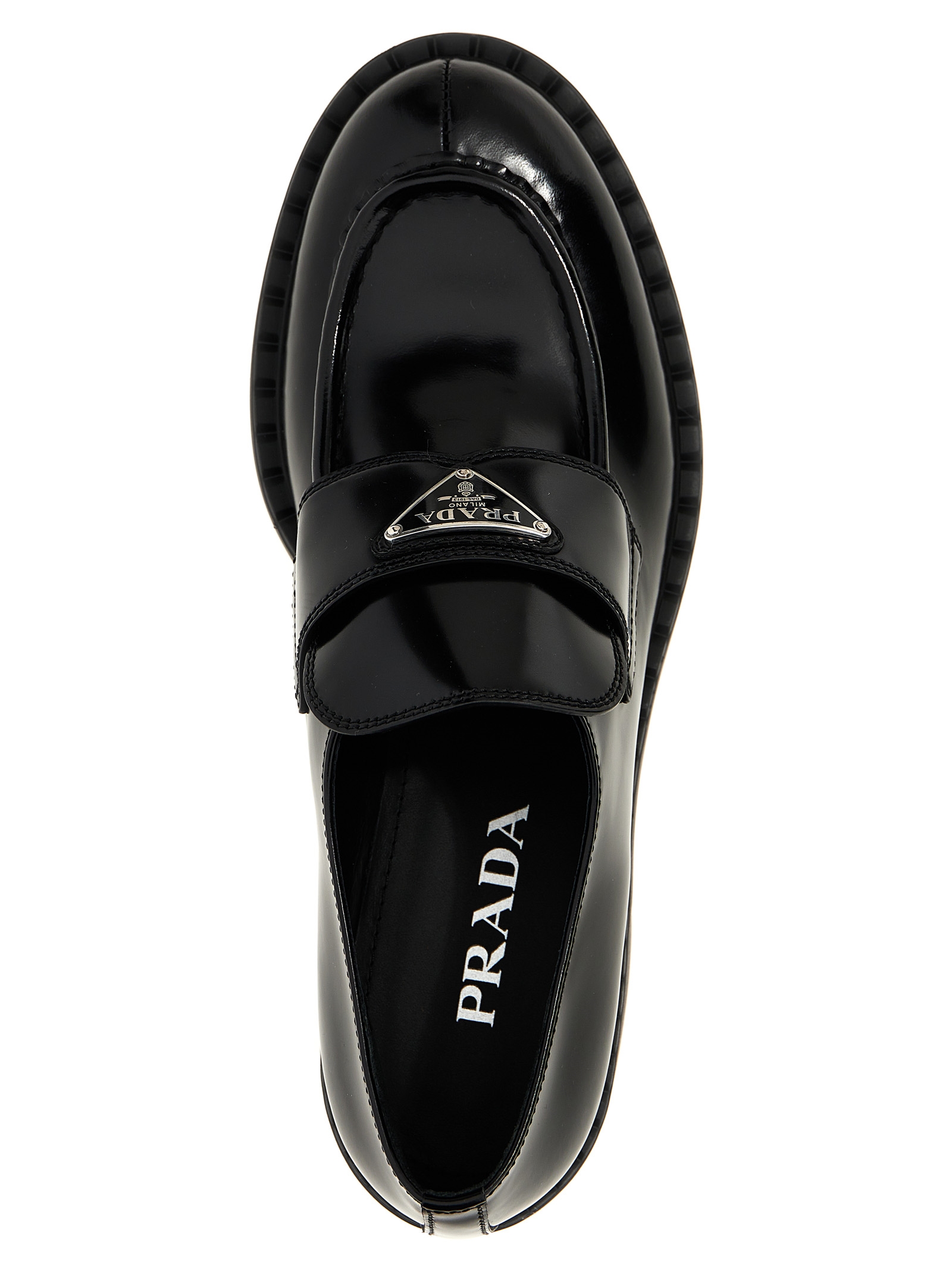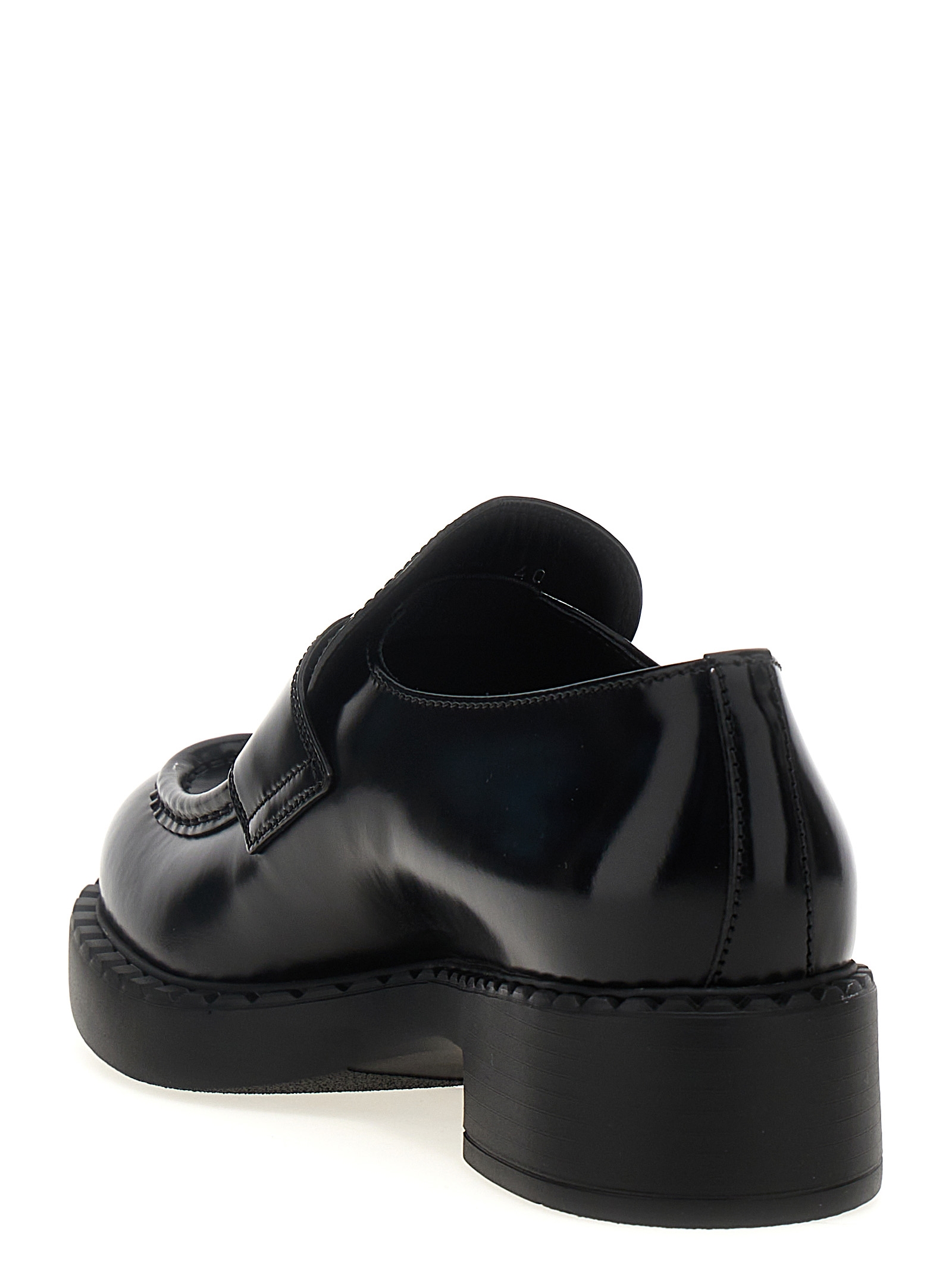 ‘Chocolate’ loafers in brushed leather with triangle enamel metal logo appliqué and monobloc rubber sole.