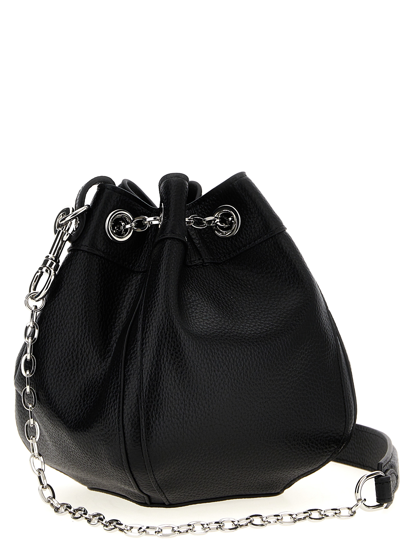 ‘Chrissy Small’ bucket bag in garnet leather-effect fabric, front metal Orb, removable wrist handle, removable chain shoulder strap with shoulder strap, chain drawstring closure.