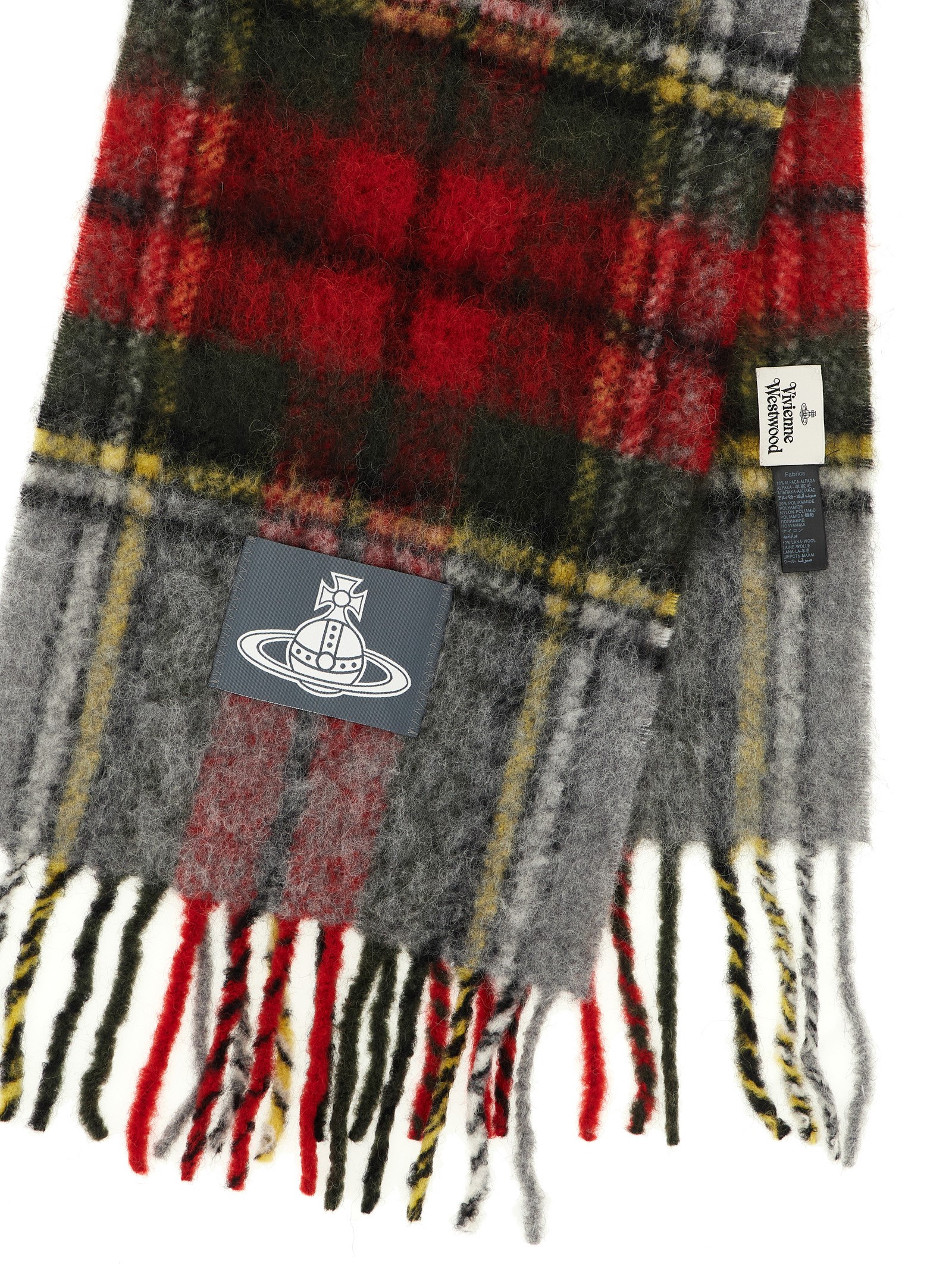 ‘Chunky Tartan’ scarf in tartan-effect wool blend with Orb patch, fringes on the edges.