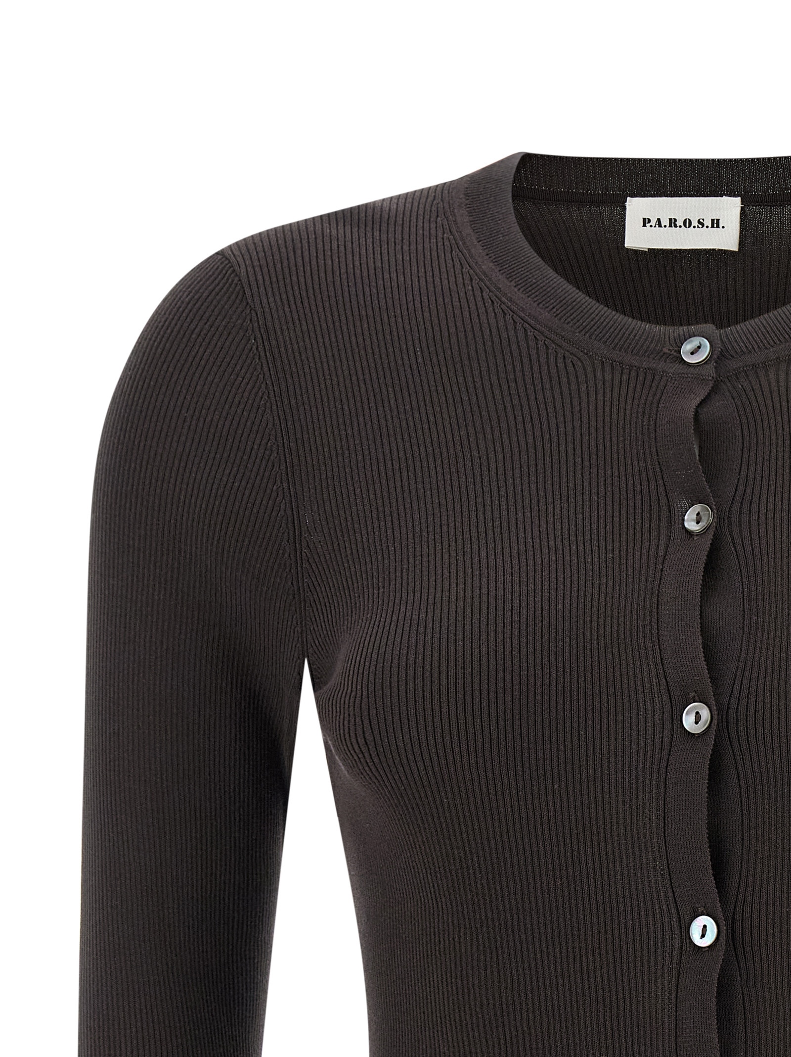 ‘Cipria26’ cardigan in light stretch ribbed cotton with round neckline, front button closure, long sleeves.