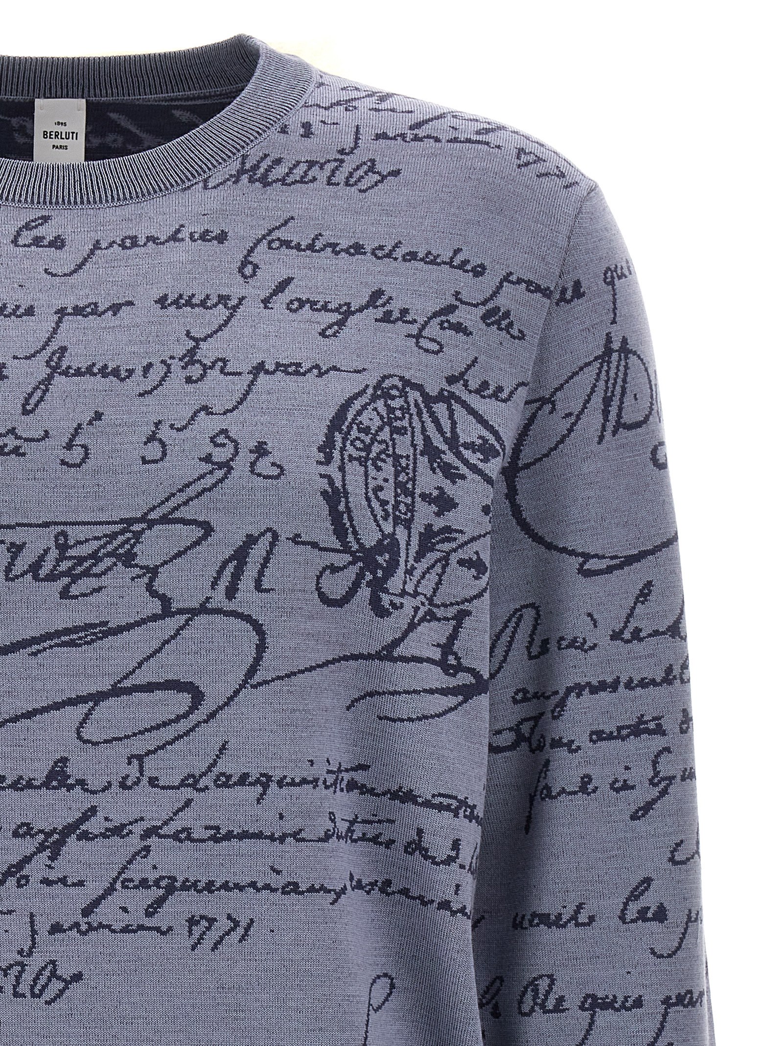 ‘Classic Scritto’ jacquard wool sweater with crew neck, long cuffed sleeves.