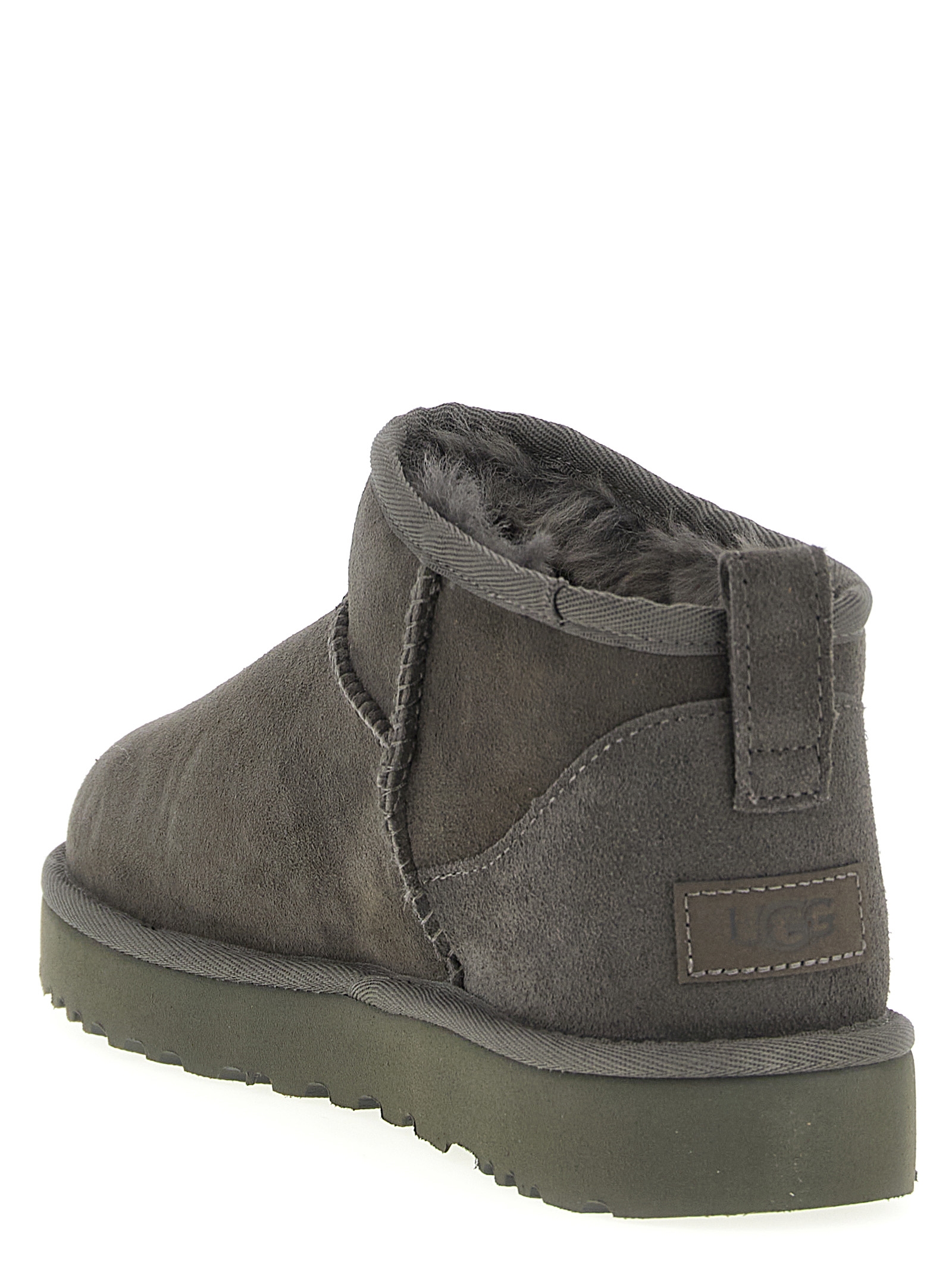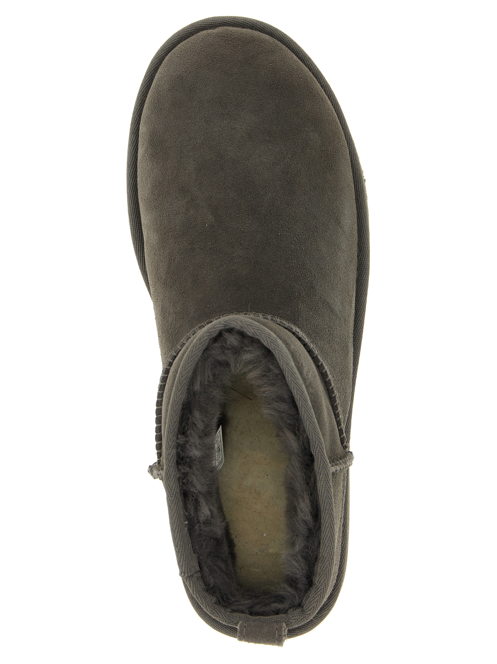 ‘Classic Ultra Mini’ water-repellent suede ankle boots with asymmetrical top trim, overlock stitching, tone-on-tone logo patch at the back, upside-down sheepskin lining and insole, sole in EVA from sugar cane or EVA Treadlite by UGG™.