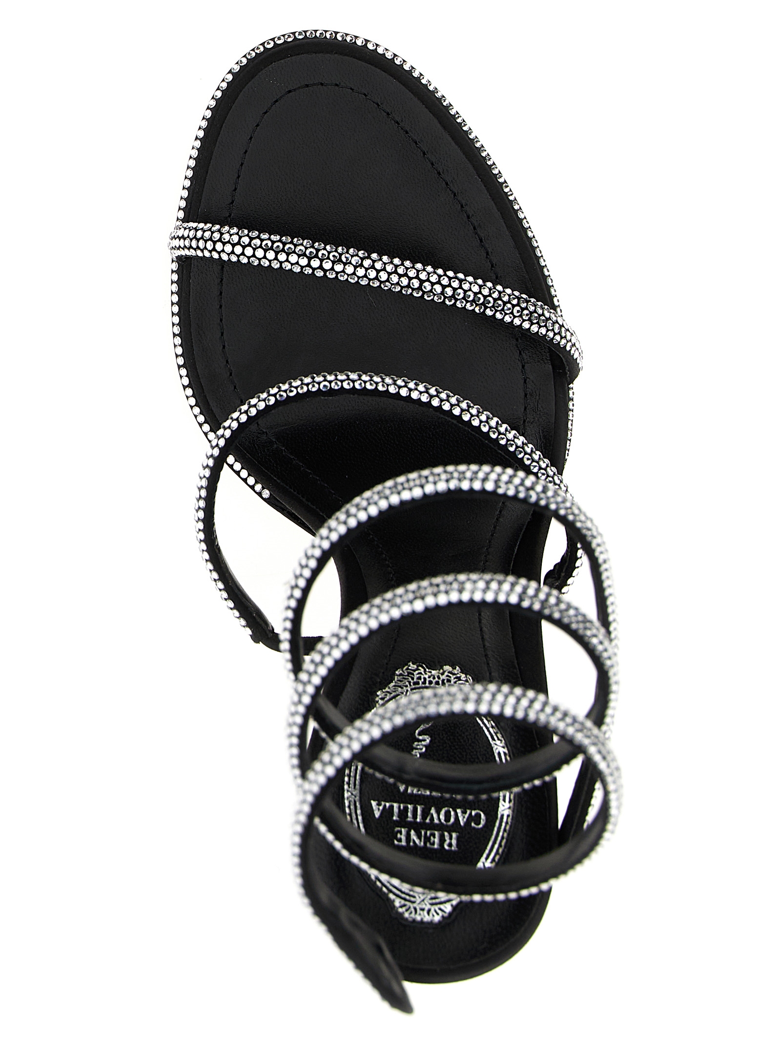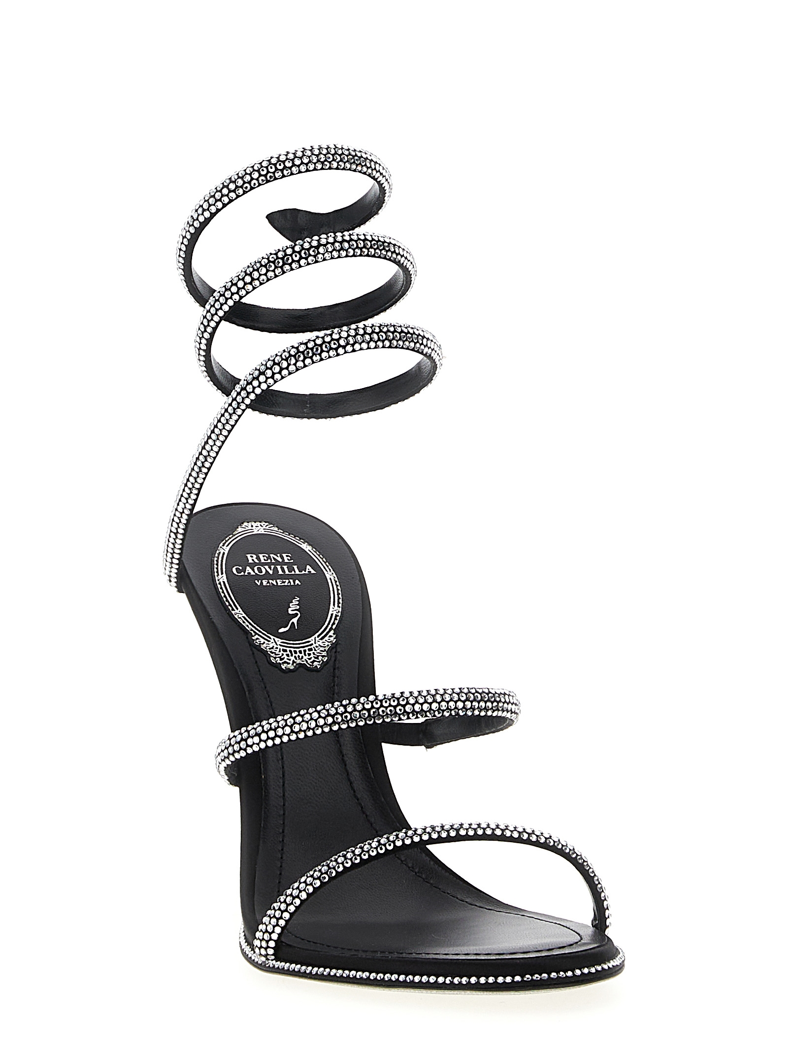 ‘Cleo’ satin sandals with all-over rhinestone appliqué, band wrapping around the ankle, heel, stardust sole.