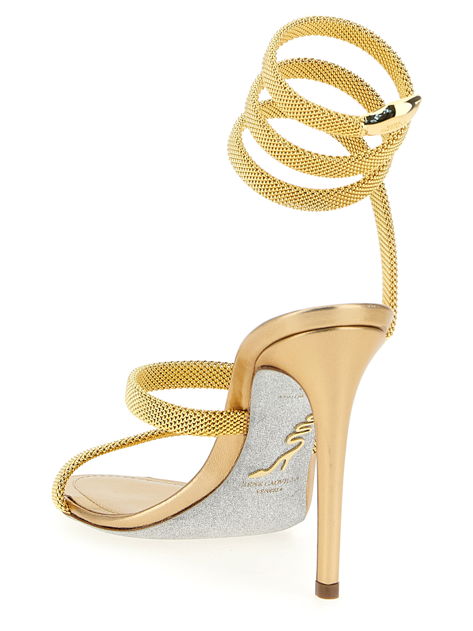 ‘Cleo’ leather and metal mesh sandals, band wrapping around the ankle with snake head detail, stiletto heel, stardust sole.